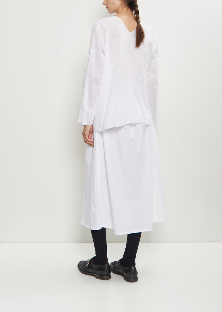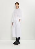 SCHA white long sleeve popover top with a round neckline in washed organic paper cotton. Features dropped shoulders, a V-neckline at back, and stitched raw edge trim finishings at neckline, armhole and hems. Can also be worn back to front.