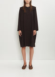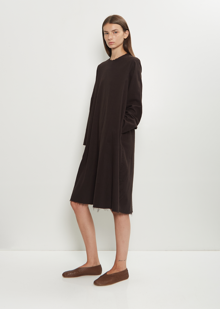 SCHA dark chocolate brown long sleeve dress with an removable Peter Pan collar in a soft and plush textured cotton. Features a round neckline, set-in sleeves, side seam pockets, mother-of-pearl buttoned keyhole at back neck, and stitched raw edge trim finishings throughout. Peter Pan collar is fastened with a mother-of-pearl button and loop.