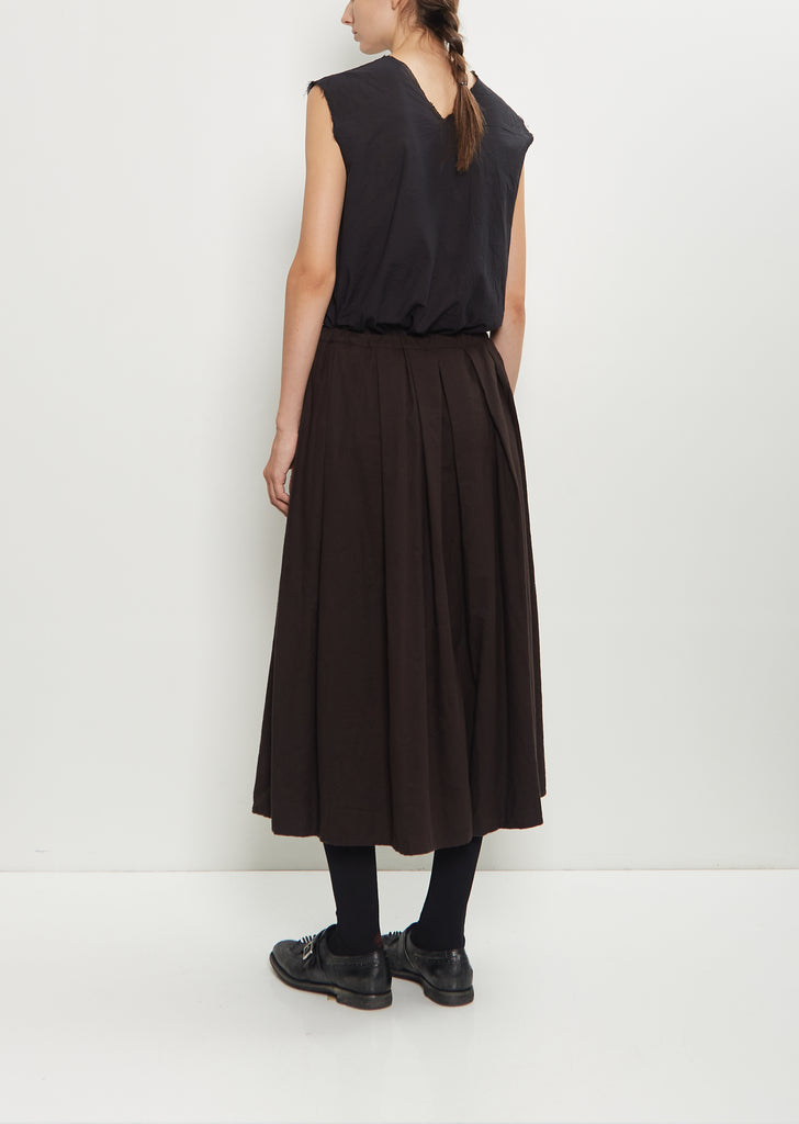 SCHA dark chocolate brown pull-on skirt with an elasticated waist and pleating throughout in a soft and plush textured cotton. Features a tonal adjustable grosgrain drawstring and one side seam pocket at left.