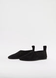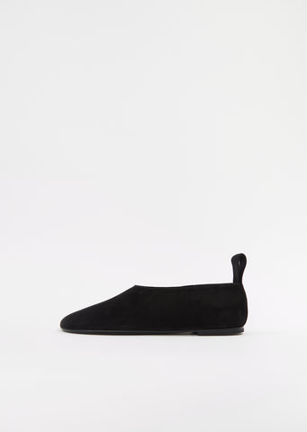 Sofie D'Hoore black ballerina with squared toe and pull tab at heel on a small stacked heel in suede leather. Lined in tonal leather.