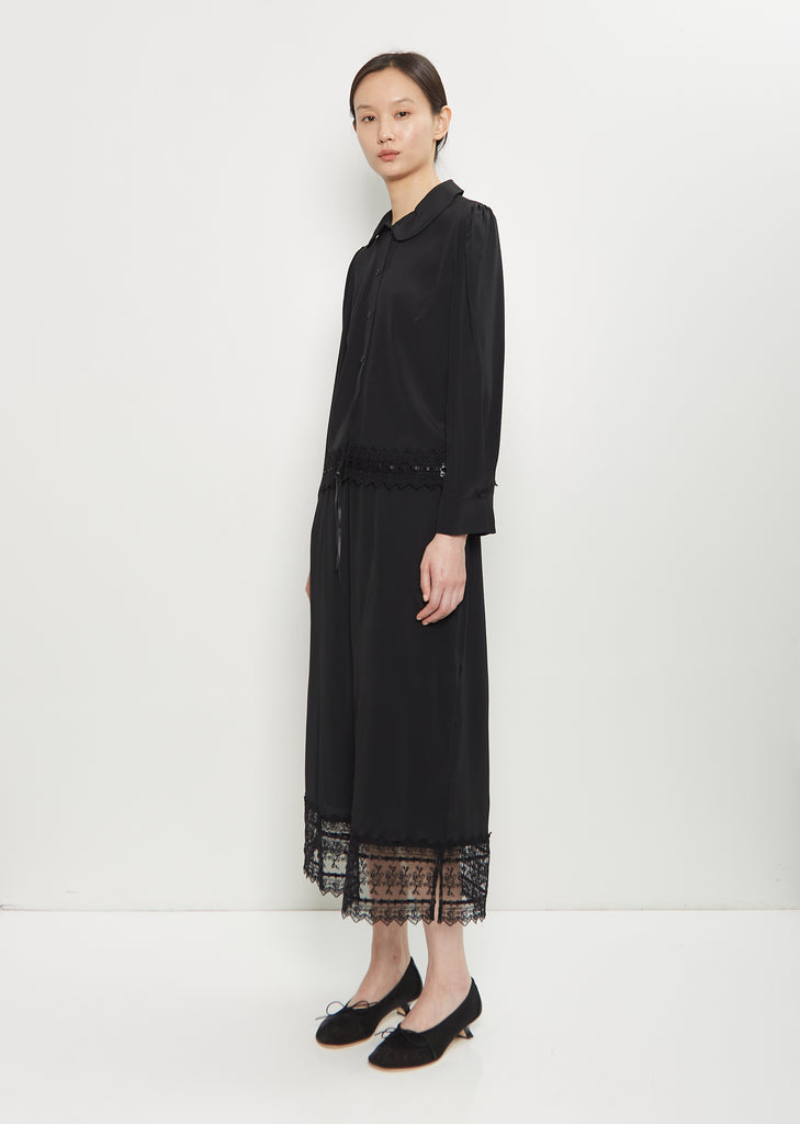 Simone Rocha black slightly cropped blouse with a tonal scalloped lace and ribbon trim at bottom hem in smooth silk and acetate blend. Features a rounded collar, a single pocket at chest, gathered detail at shoulder, buttoned cuffs and a tonal buttons closure at front.
