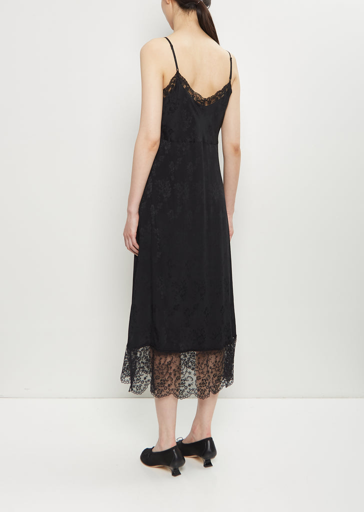 Simone Rocha black A-line slip dress with lace trim at neckline and hem in smooth silk and acetate blend with a tonal flower brocade. Features a sweetheart neckline, an empire waistline, gathered detail at chest, and thin adjustable straps.