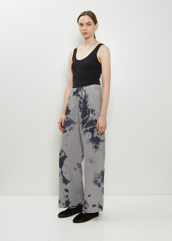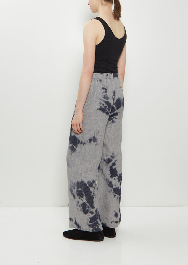 Suzusan black and light grey pull-on pants with wide, straight legs and an elasticated waist in soft linen wool twill with a traditional Shibori pattern. Features belt loops, side seam pockets, a buttoned welt pocket at back, and an interior adjustable drawstring at waist.