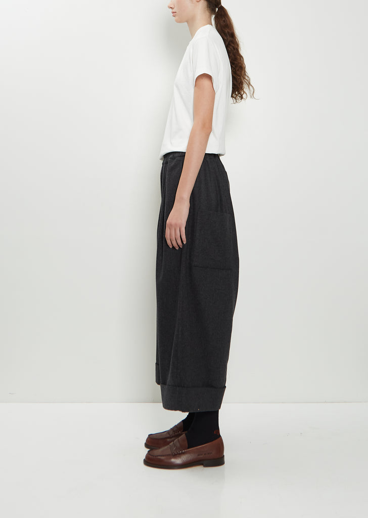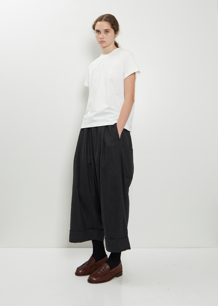 Toogood signature charcoal grey cropped pull on trouser with front pleats and an elasticated waistband in felted wool cashmere. Features an interior adjustable drawstring, side seam pockets, a single low patch pocket at back and cuffed hems. Relaxed fit.