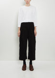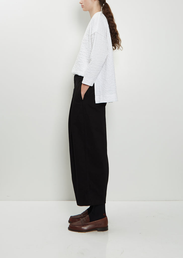 Toogood flint black cropped trouser with wide, tapered legs and front pleats in mid-weight organic cotton twill. Features a half-elastic waistband, wide belt loops, side seam pockets, a single deep patch pocket at back, darts at bottom hems, and a concealed button-fly closure with a single exposed button at waist. Finished with tonal wooden buttons throughout.