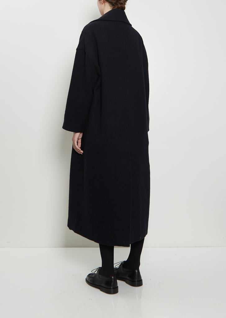 Toogood ink black double breasted long coat with large notched lapels in a mid-weight wool and cashmere herringbone. Features dropped shoulders, vertical welt pockets, and a vent at back. Lined in black cupro and cotton blend fabric. Finished with glossy horn-hued buttons throughout.