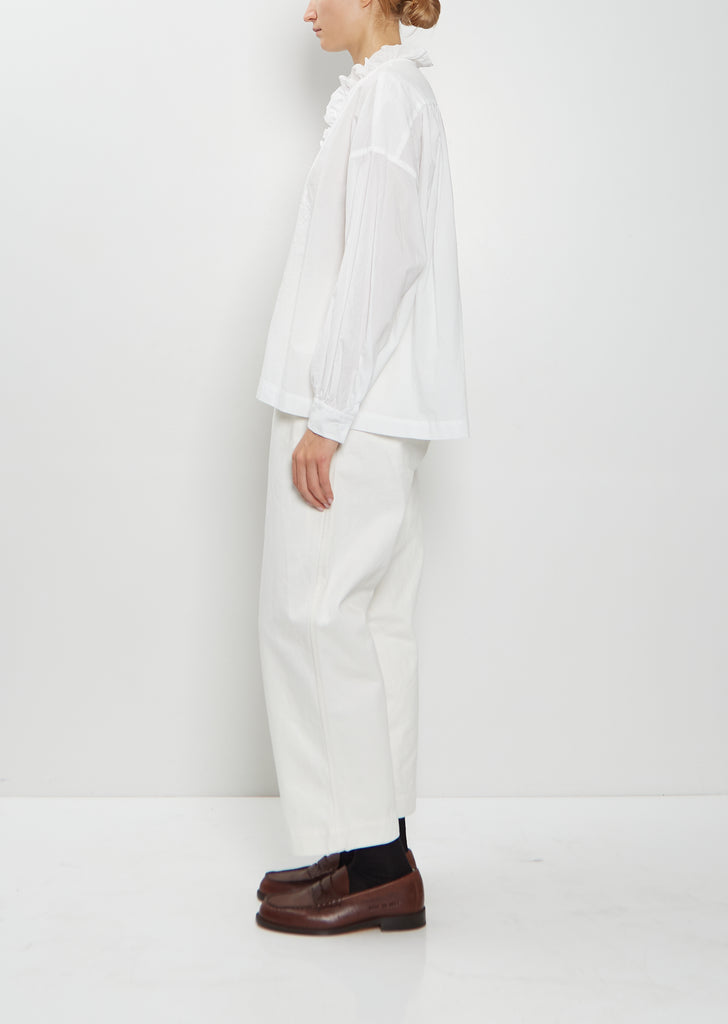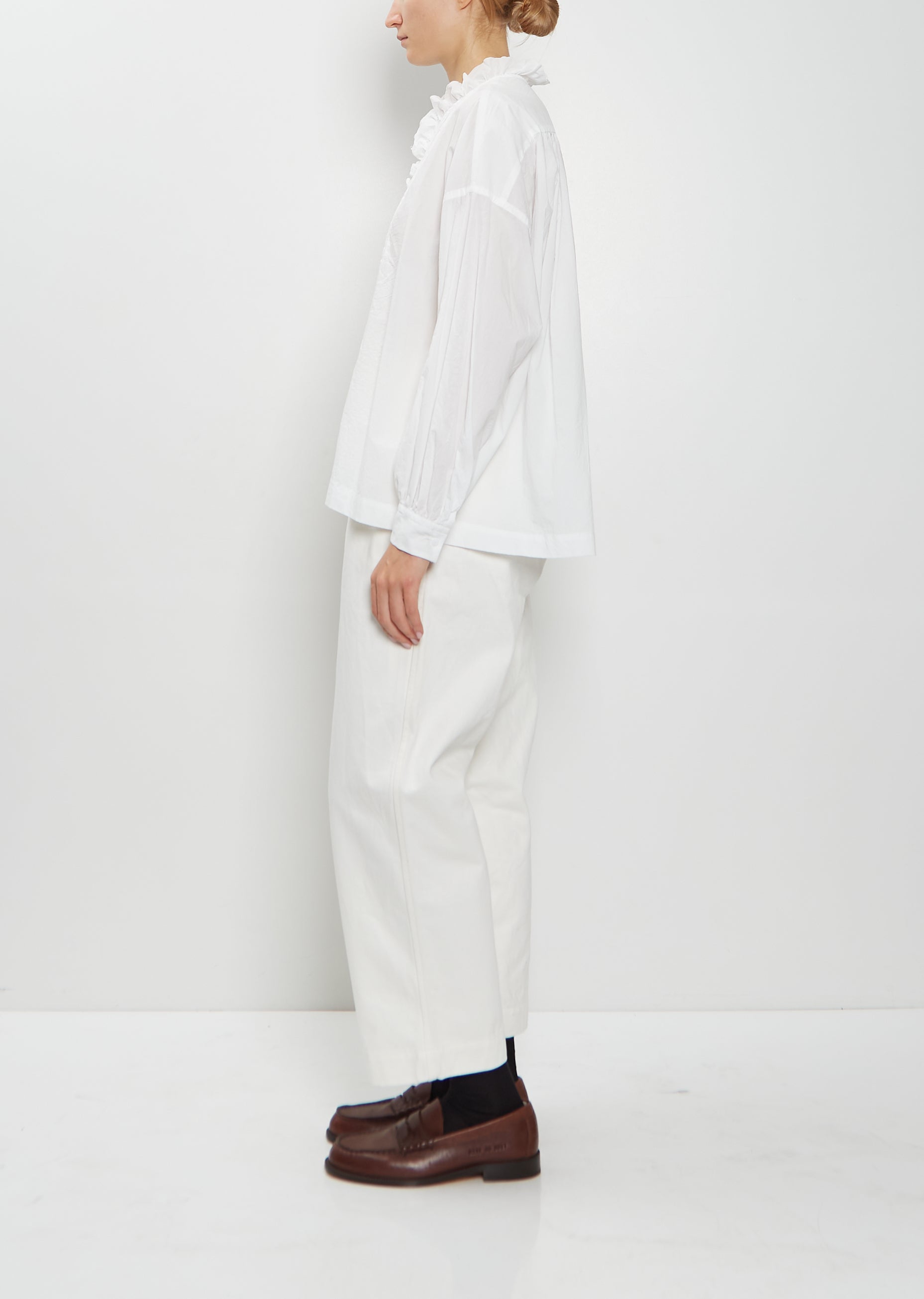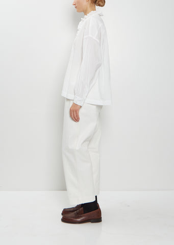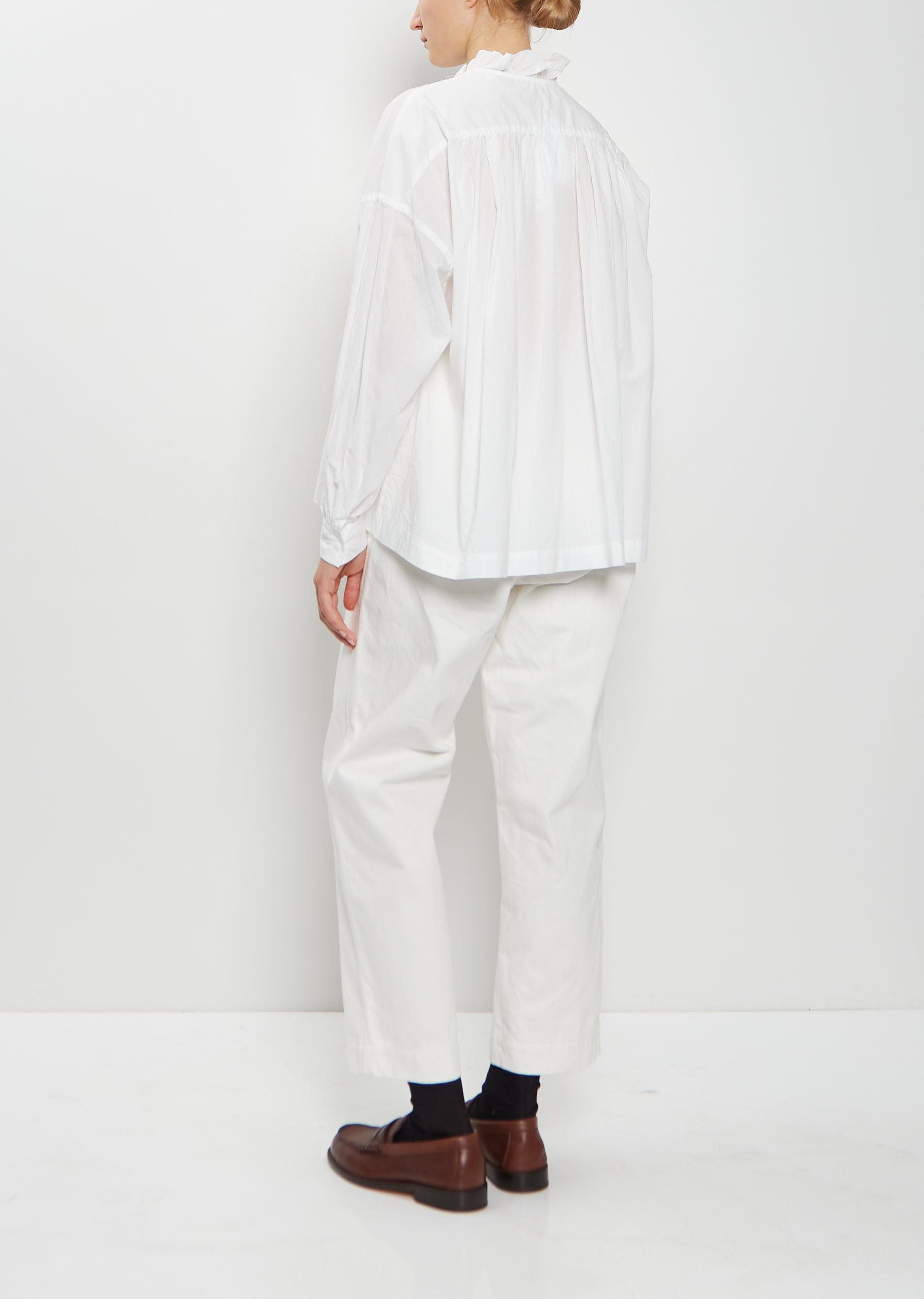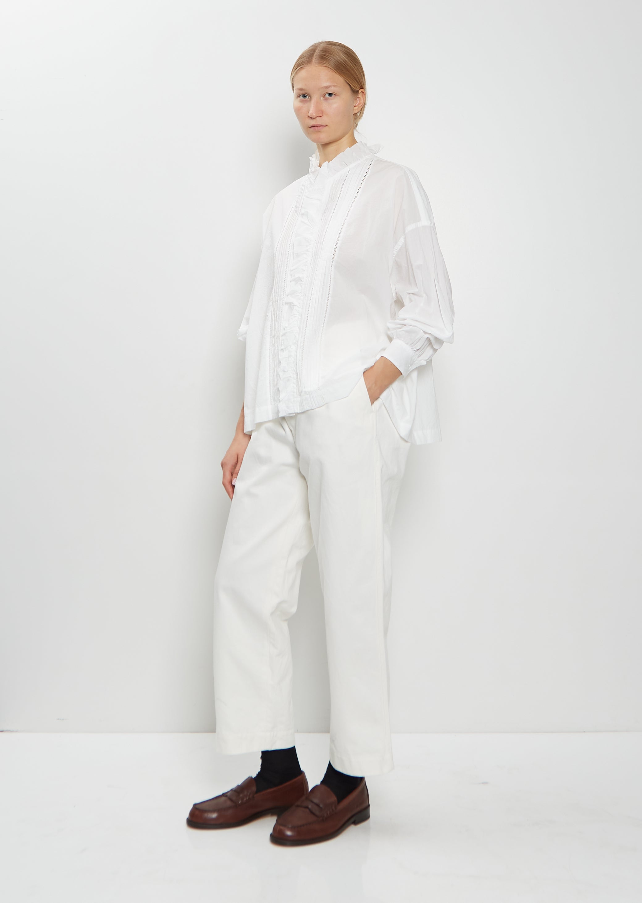 Toujours white shirt with ruffle detail at neck and placket in crisp cotton. Features pintuck and lace panels at front, dropped shoulders, gathered buttoned cuffs, back yoke with gathered detail and a tonal shell-hued buttons closure.