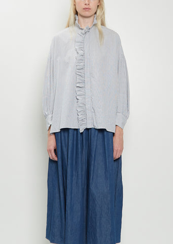 Toujours white and grey checks shirt with ruffle detail at neck and placket in crisp cotton. Features dropped shoulders, gathered buttoned cuffs, back yoke with gathered detail and a shell-hued buttons closure.