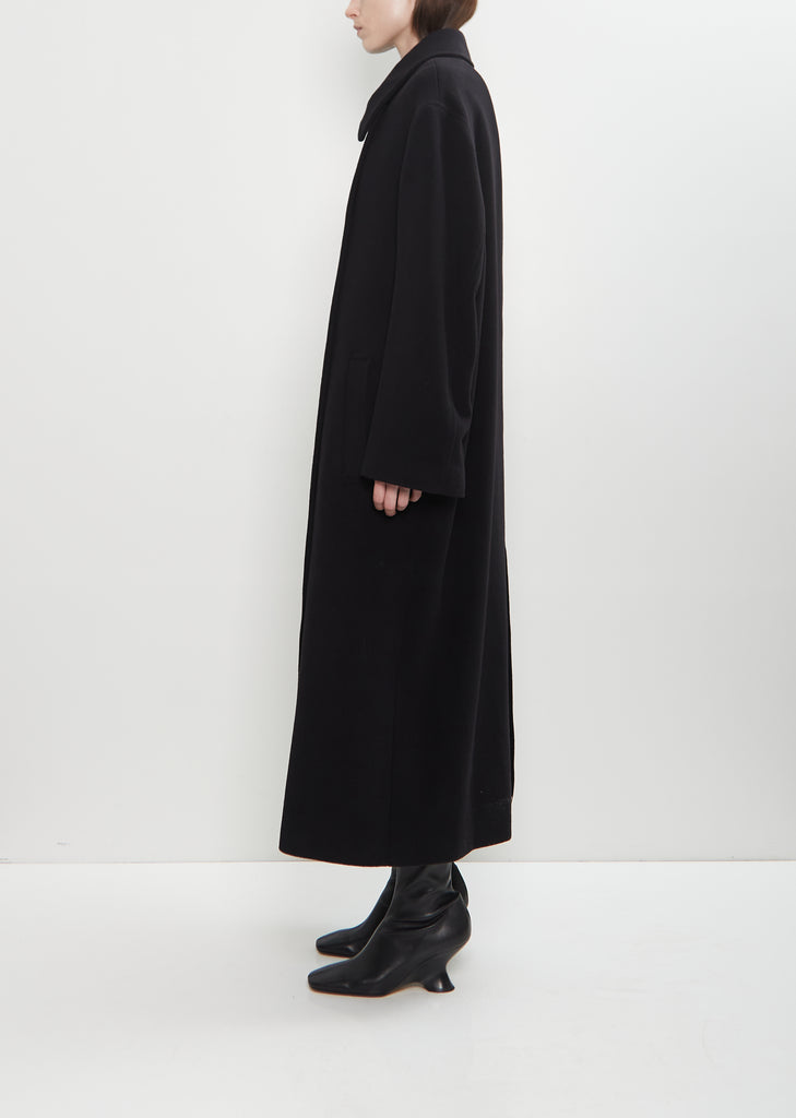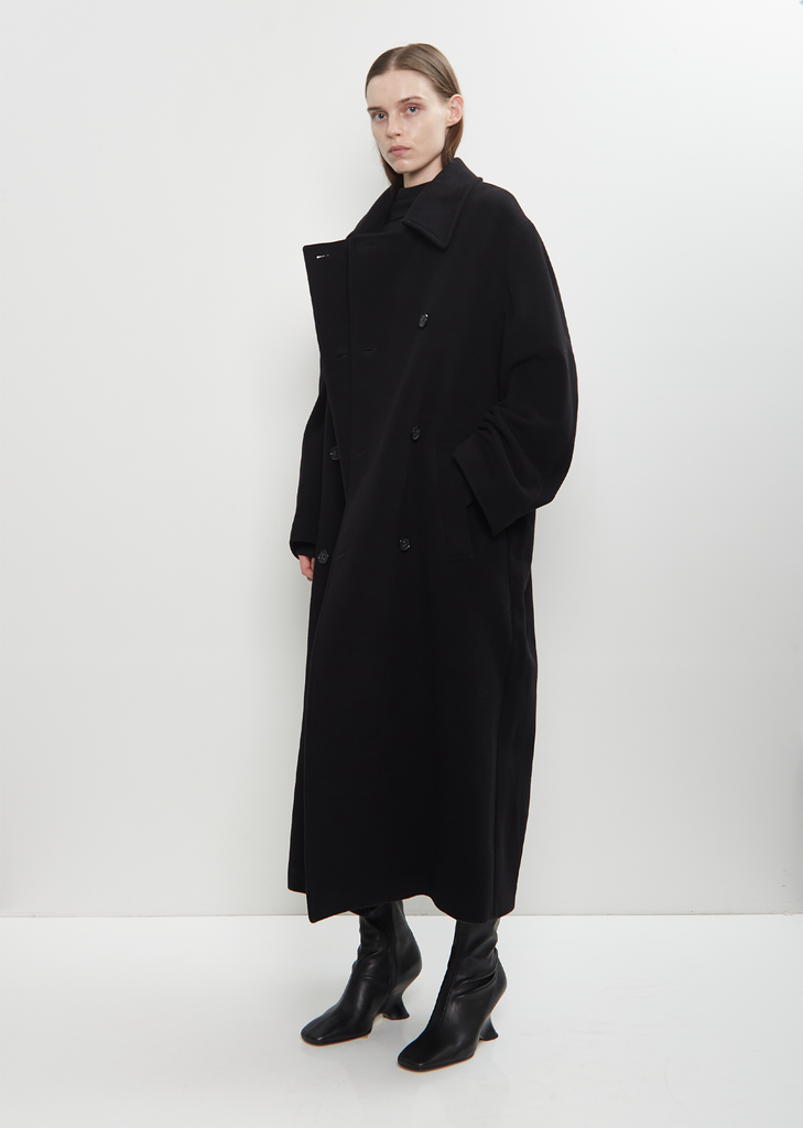Toteme black double breasted oversized coat with a large pointed collar and horn-hued button front in a brushed wool blend. Features dropped shoulders, vertical welt pockets, vent at back, and an interior buttoned welt pocket. Lined in tonal viscose.