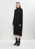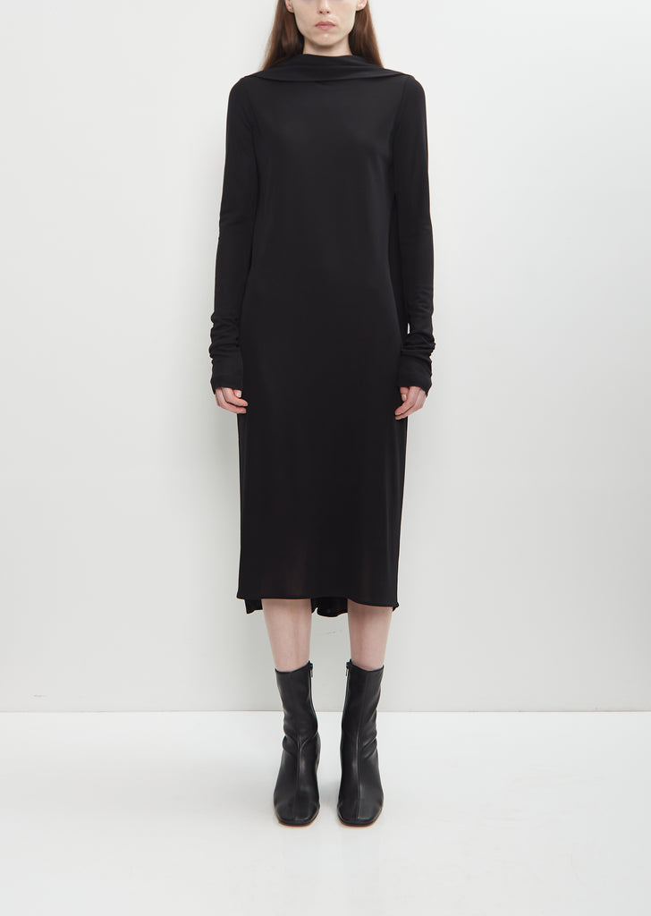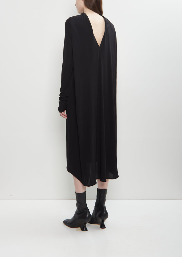 Toteme black long sleeve dress with a fluid cocoon silhouette and high neckline in viscose jersey. Features set-in sleeves, a V-neckline at back, and back panels that mimic a cape.
