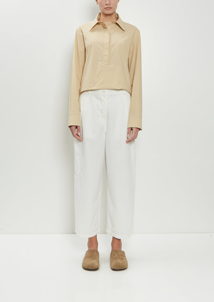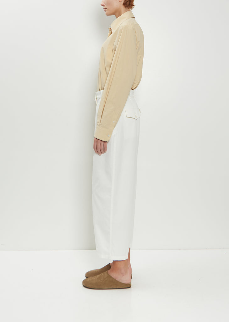 The Row white pant with cropped, wide legs in a lightweight cotton and cashmere blend twill. Features belt loops, vertical buttoned flap pockets, tool pocket at front right leg, buttoned flap welt pockets at back, and a button-fly fastening.