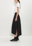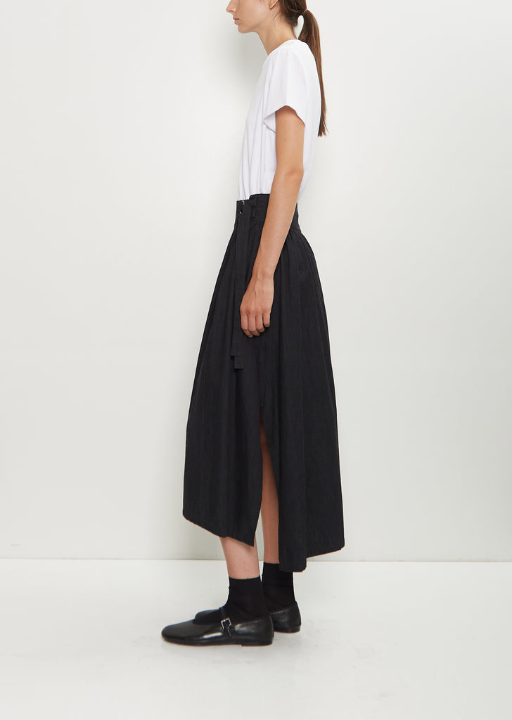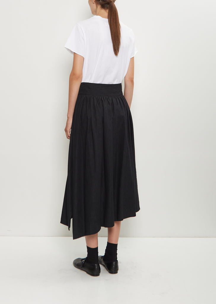 Y's black skirt with a double self belt and gathered waist in cotton twill. Features one welt pocket at right, split side seam detail at left, and a concealed button and zipper fastening at waist. Comes unlined.