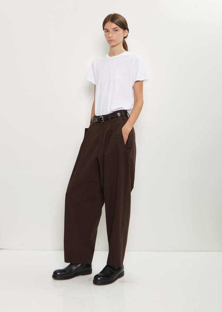 Y's brown pants with wide, tapered legs and two pleats at front in mid-weight cotton twill. Features belt loops, adjustable tabs at waist, buttoned flap pockets at sides, a single buttoned welt pocket at back, and a button and zip-fly fastening.