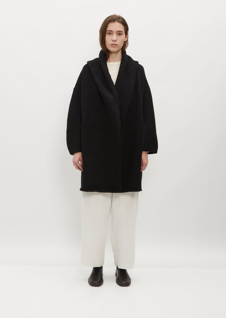 Brand Signature Piece — Lauren Manoogian black melange capote coat softly felted in handloomed alpaca. Boxy silhouette with an oversized fit.