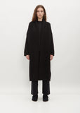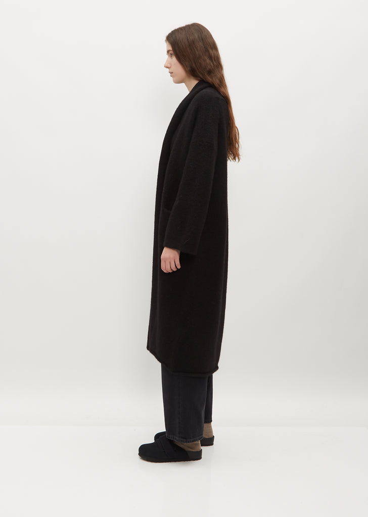 Brand Signature Piece — Lauren Manoogian black long open front cardigan with a shawl collar softly felted in handloomed alpaca. Straight silhouette with a relaxed fit.