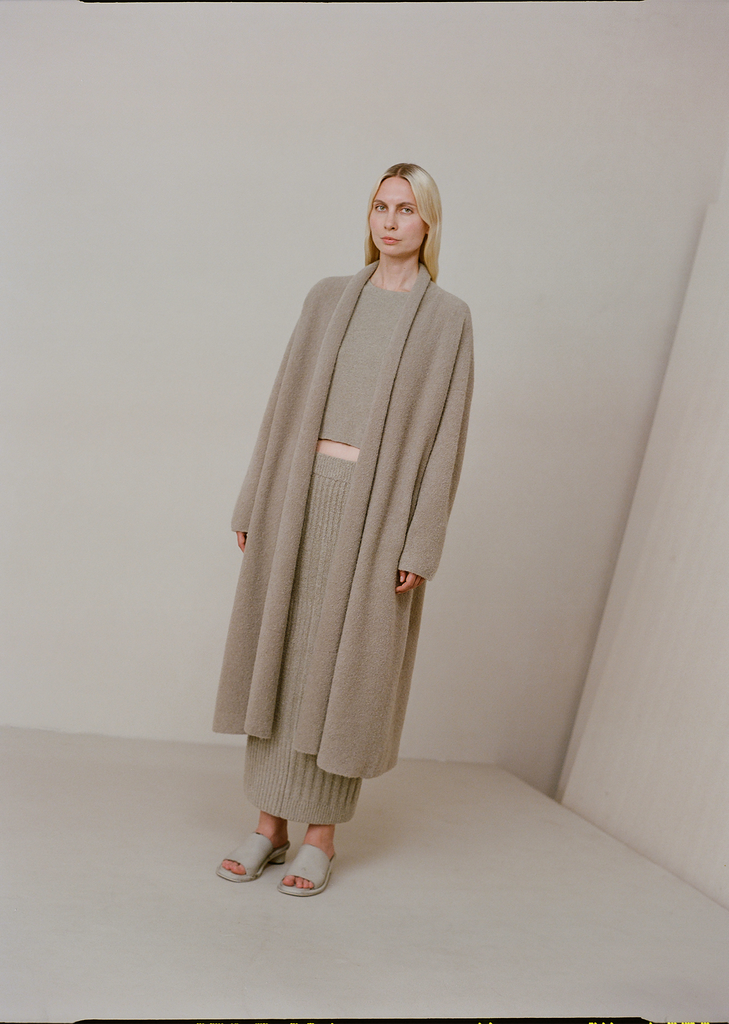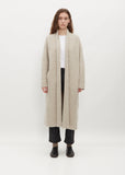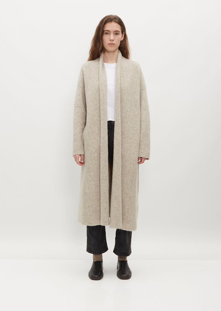 Lauren Manoogian pebble melange long open front cardigan with rolled collar softly felted in double faced baby alpaca and extra fine merino wool blend. Straight silhouette with an oversized fit.
