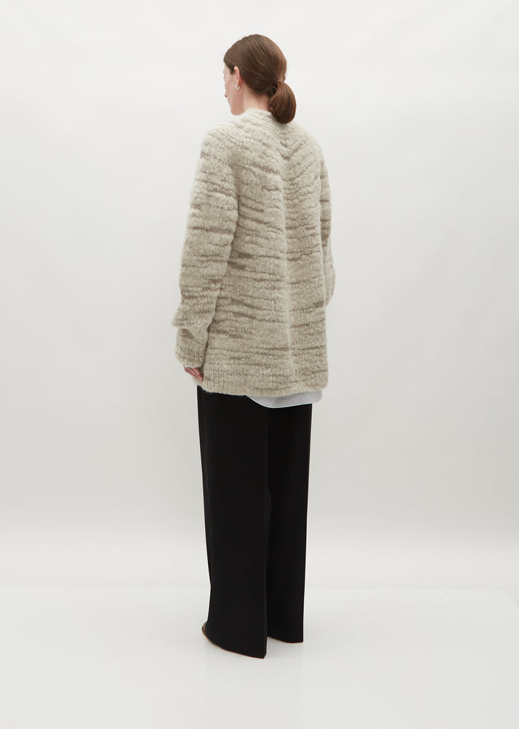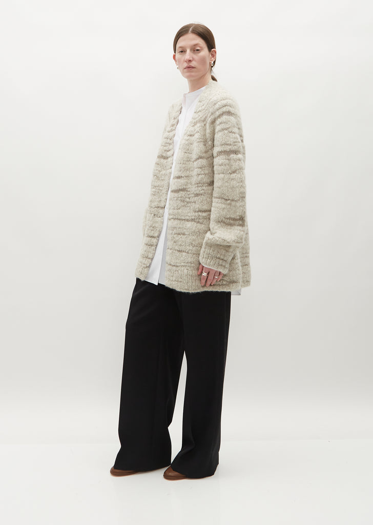 Lauren Manoogian warm white open front cardigan with irregular texture hand knitted in heavy gauge Suri alpaca and Highland wool blend. Boxy silhouette with an oversized fit.
