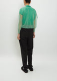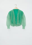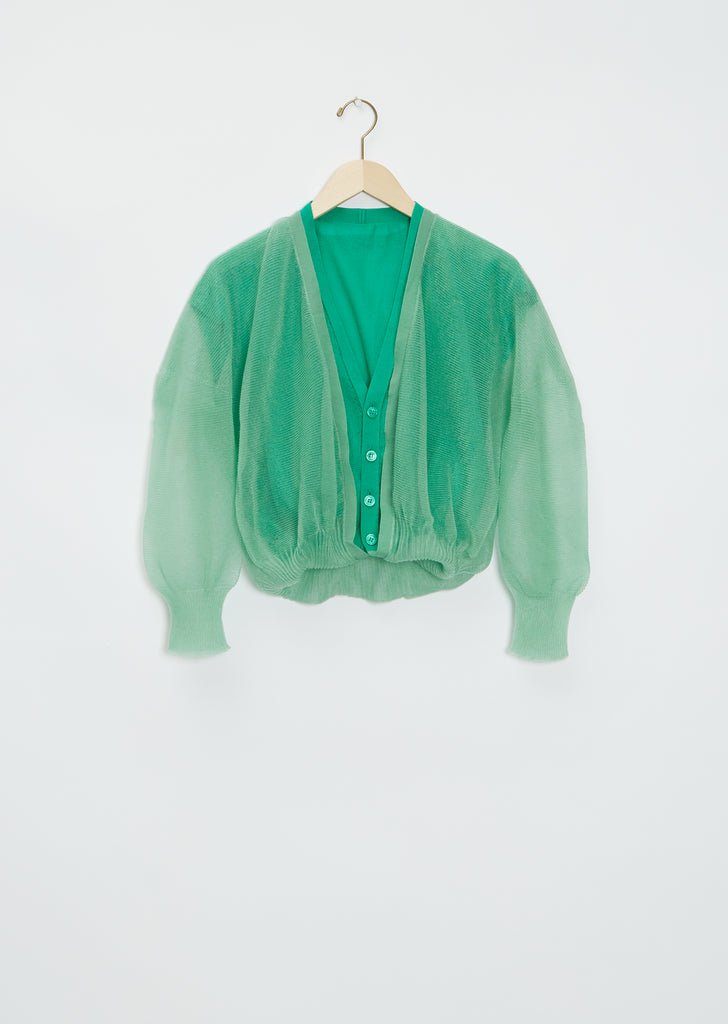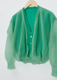 Issey Miyake two-toned mint green double-layer cropped cardigan with a v-neck and sheer outer layer in a nylon polyester blended knit.