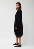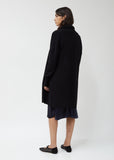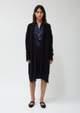 Shawl-collar open-front cardigan fine-gauge-knitted from black cashmere-lambswool yarn. Drop shoulders. Long, exaggerated sleeves. Shallow back yoke. Rib-stitched cuffs and bottom band. Straight, above-the-knee hem. Relaxed fit.