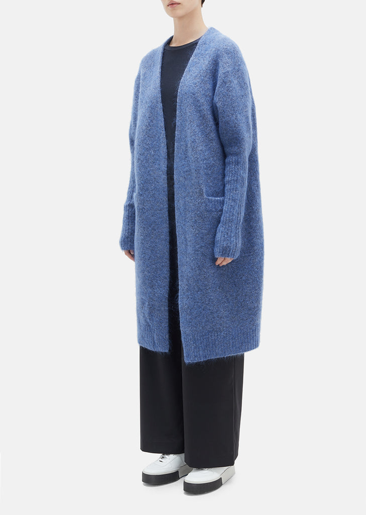 Blue melange mohair-blend cardigan with accentuated ribbed trim at cuffs, extending well beyond the elbow. Relaxed fit. Dropped shoulders. Ribbed trim at side patch pockets and bottom hem. Color: Huskey Grey. 34% Mohair, 34% Wool, 27% Polyamide, 5% Elastane.