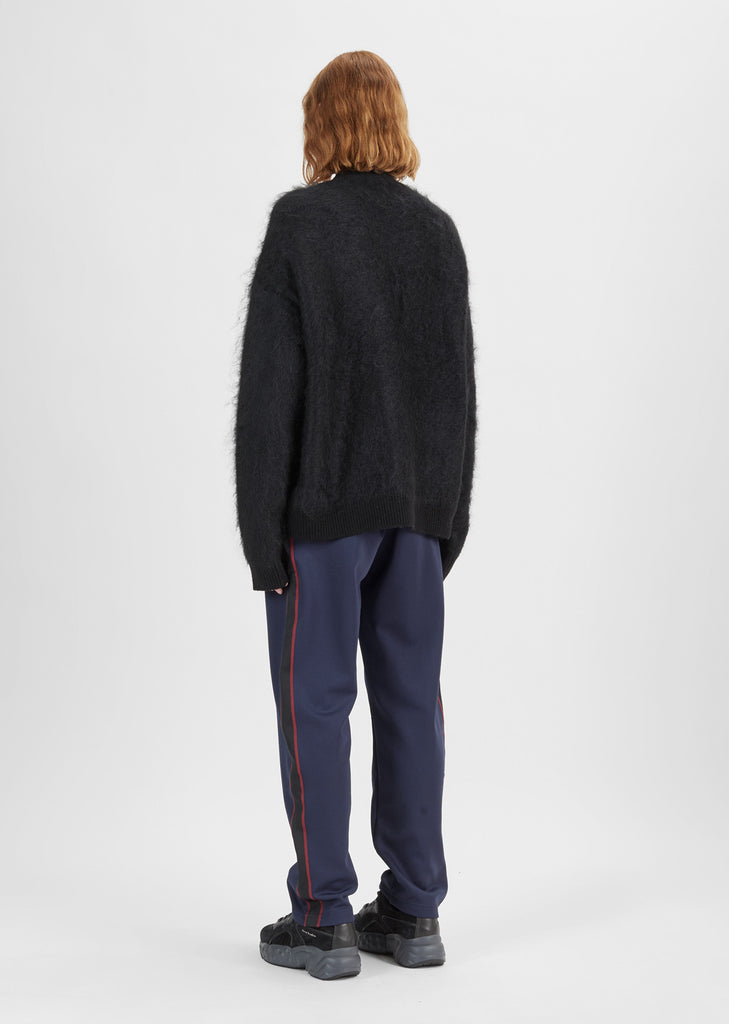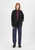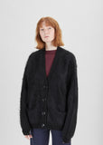 Black knit cardigan in a soft blend of mohair and wool, with tonal merino wool trim throughout. Relaxed fit. Dolman sleeves. Front pockets. Ribbed trim along the front, cuffs, and hem. Color: Black. 32% Mohair, 32% Wool, 31% Nylon, 5% Elastane; Ribbed Trim: Merino Wool.