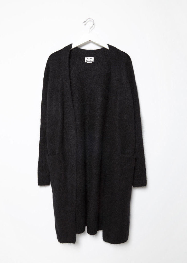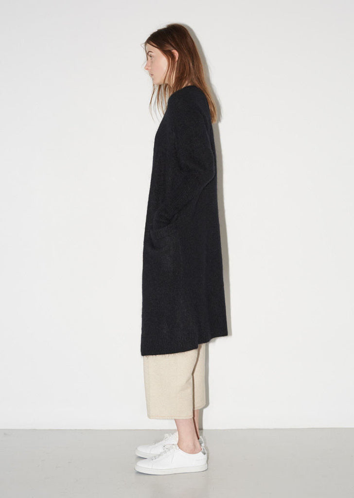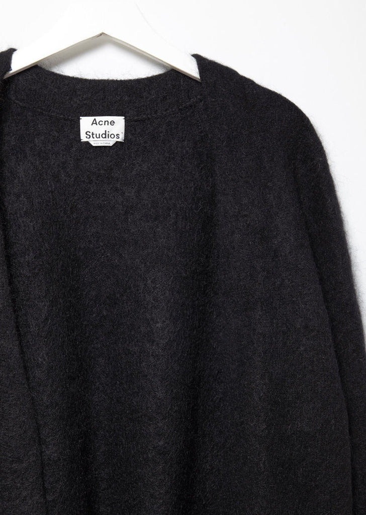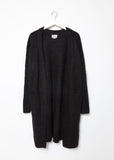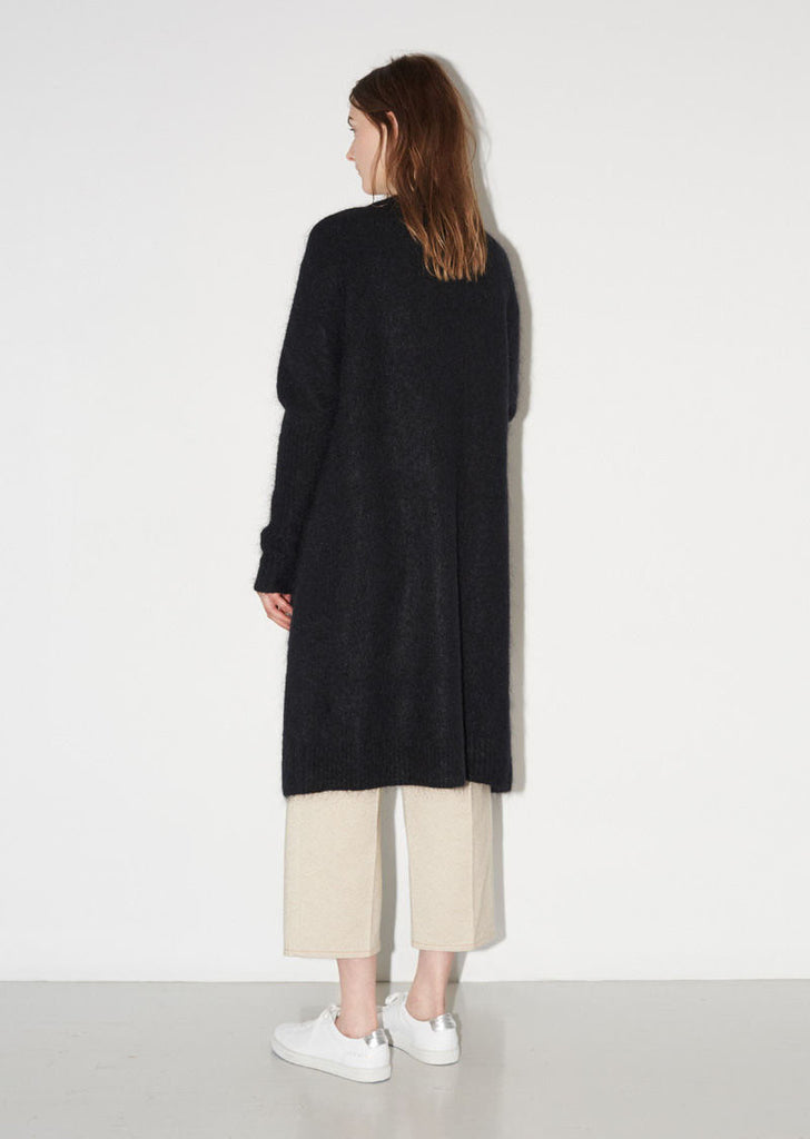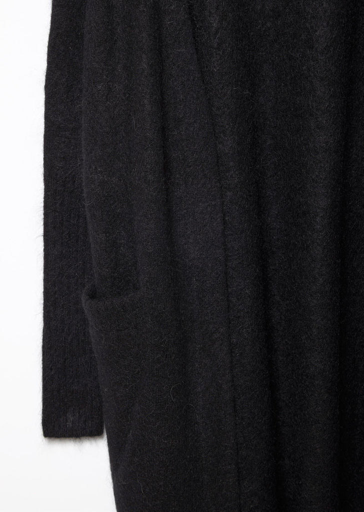 Black mohair-blend open-front long cardigan with accentuated ribbed trim at cuffs, extending well beyond the elbow. Relaxed fit. Dropped shoulders. Ribbed trim at side patch pockets and bottom hem. Color: Black. 34% Mohair, 34% Wool, 27% Polyamide, 5% Elastane. Imported.