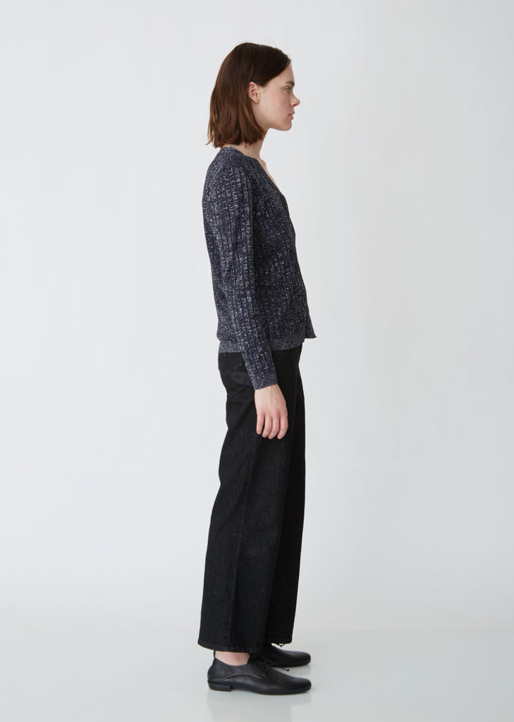 Classic ribbed knit cardigan in dark blue metallic yarn with mother-of-pearl buttons. Relaxed, slim fit. Can be worn open as a cardigan or buttoned up as a v-neck sweater. Finished with ribbed trim along the neckline and placket. Color: Marine. 84% Acetate. 10% Metalized polyester. 6% Polyamide. Imported.