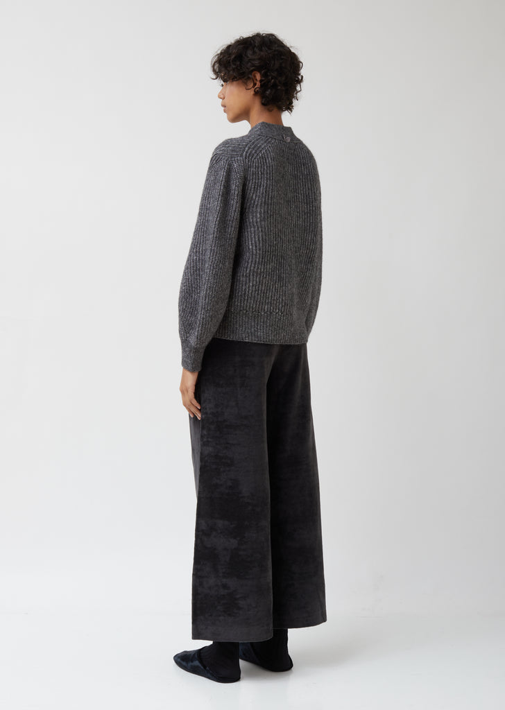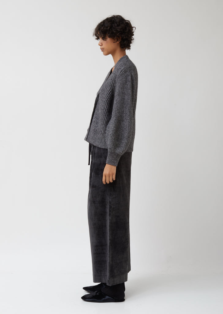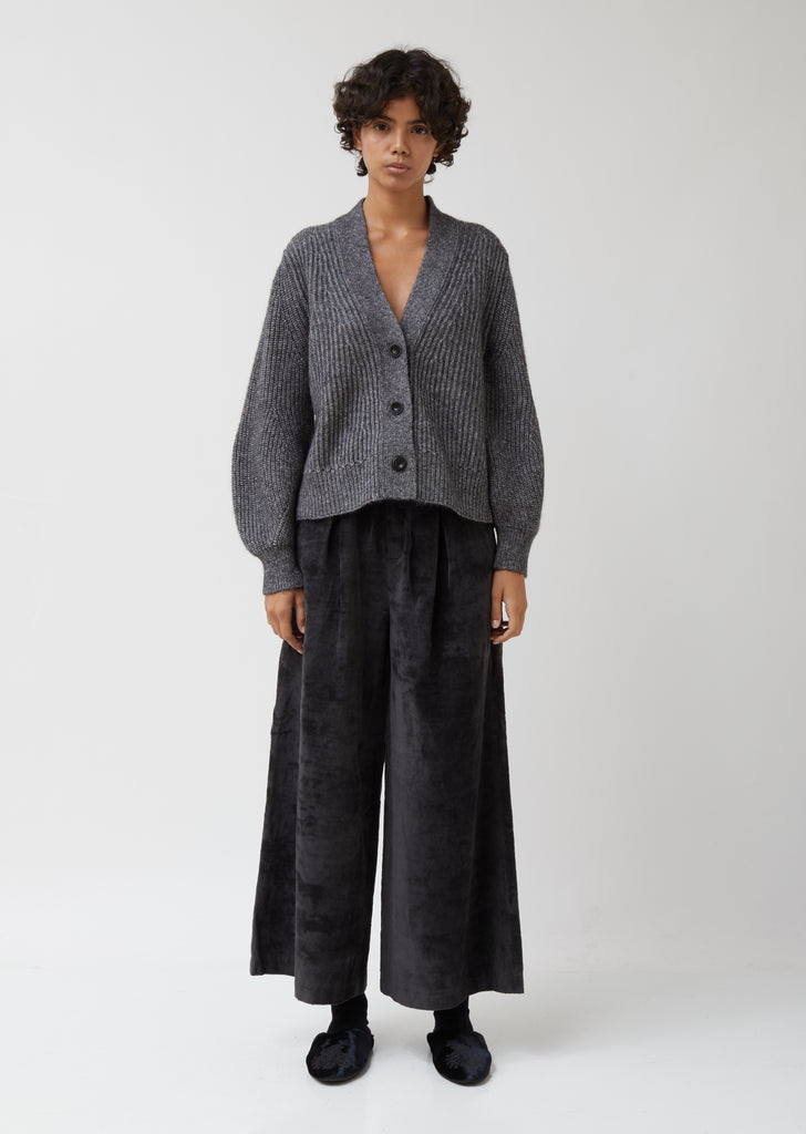Button-front cardigan rib-knitted from heather-grey cotton-alpaca-blend yarn. V-neck. Drop shoulders. Blouson sleeves. Three-button front. Black corozo buttons. Ribbed neckline, placket, cuffs, and hem. Hem is slightly curved in front and longer in back. Relaxed fit.