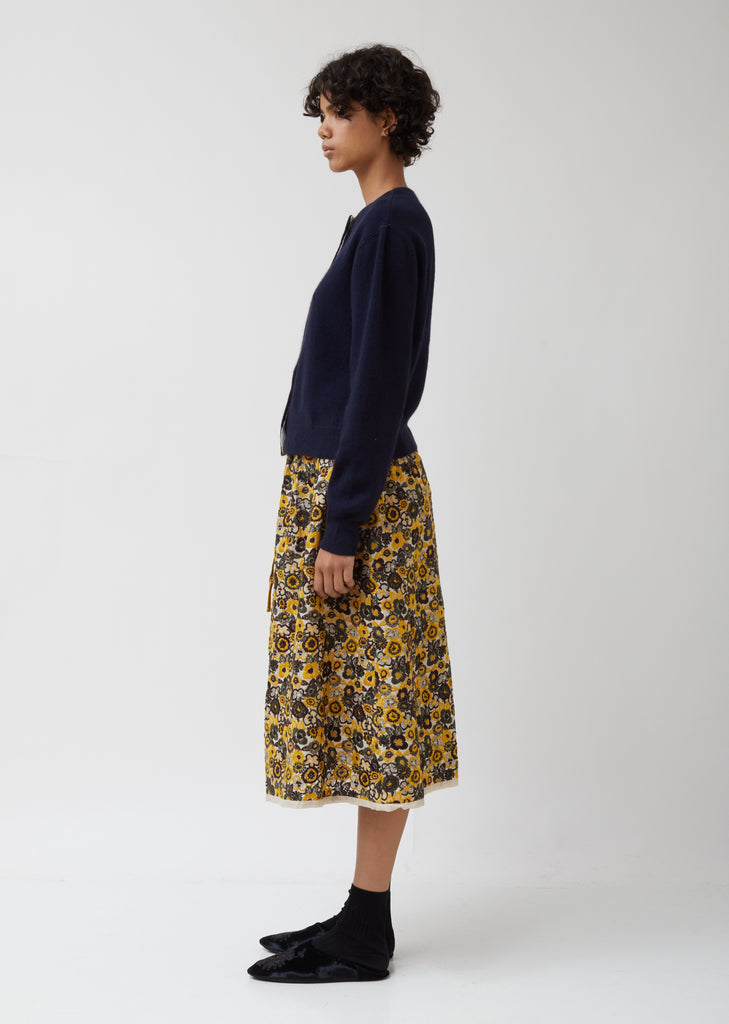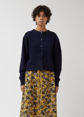 Button-front round-neck cardigan fine-knitted from navy wool-blend yarn, featuring white cotton interfacing at the neckline and placket. Drop shoulders. Ribbed cuffs and bottom band. Tonal buttons. Straight hem. Relaxed fit.