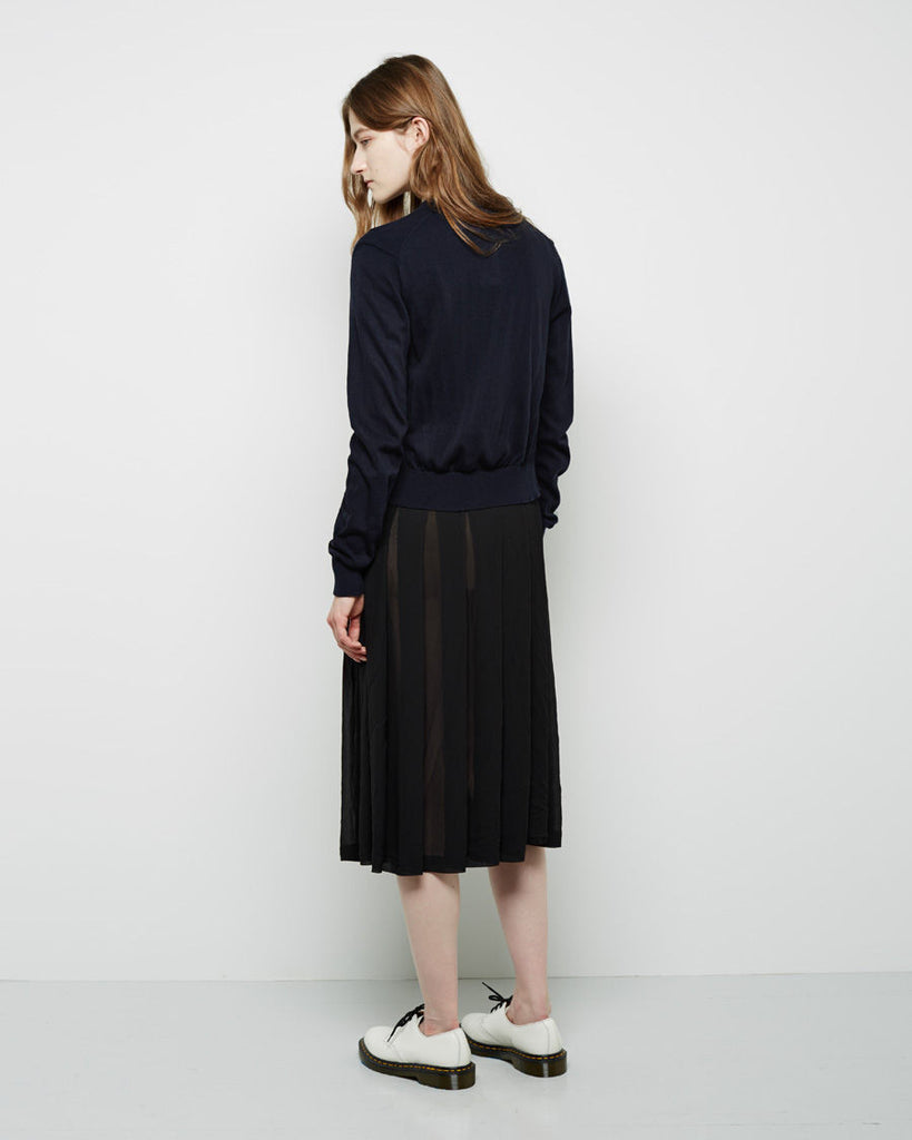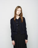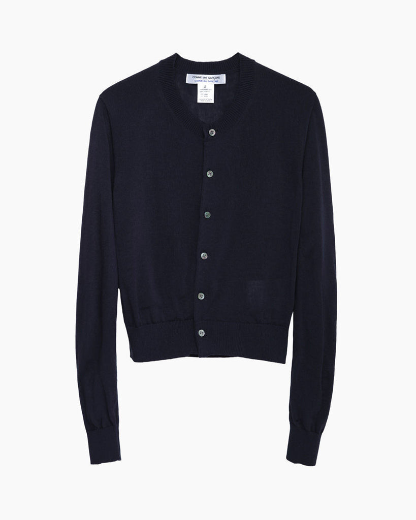 From Rei Kawakubo's soft & moody, Comme des Garçons Comme collection comprised of layerable classics with an avant-garde twist; a classic, crew neck cardigan in a very fine rib knit.