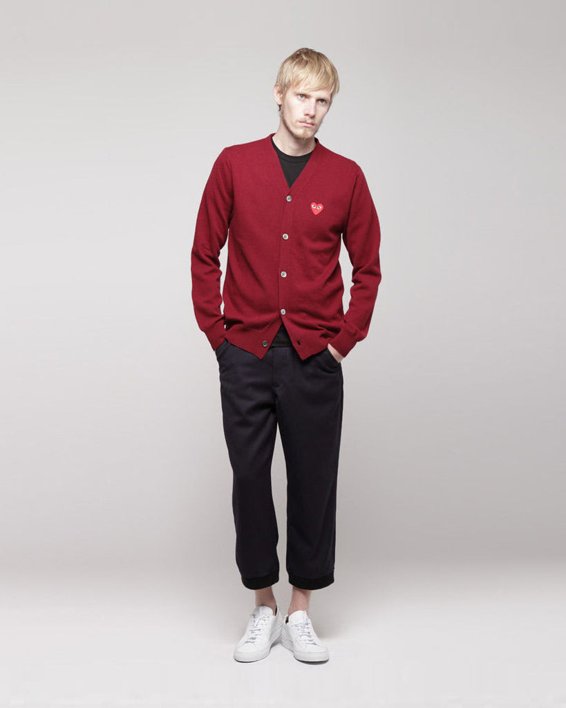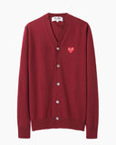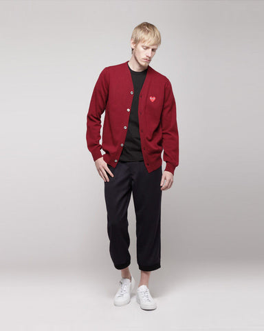 Men's Emblem V-Neck Cardigan by Comme Des Garçons Play.  From the men's collection; classic v-neck cardigan with red emblem detail.