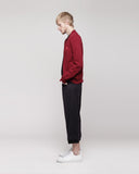 V-neck / Red heart emblem patch at front left side / Rib cuffs & hem / Length hits at hip / Button front closure / Slightly relaxed fit / Color: Burgundy / 100% Wool / Made in Japan / Also available in Grey