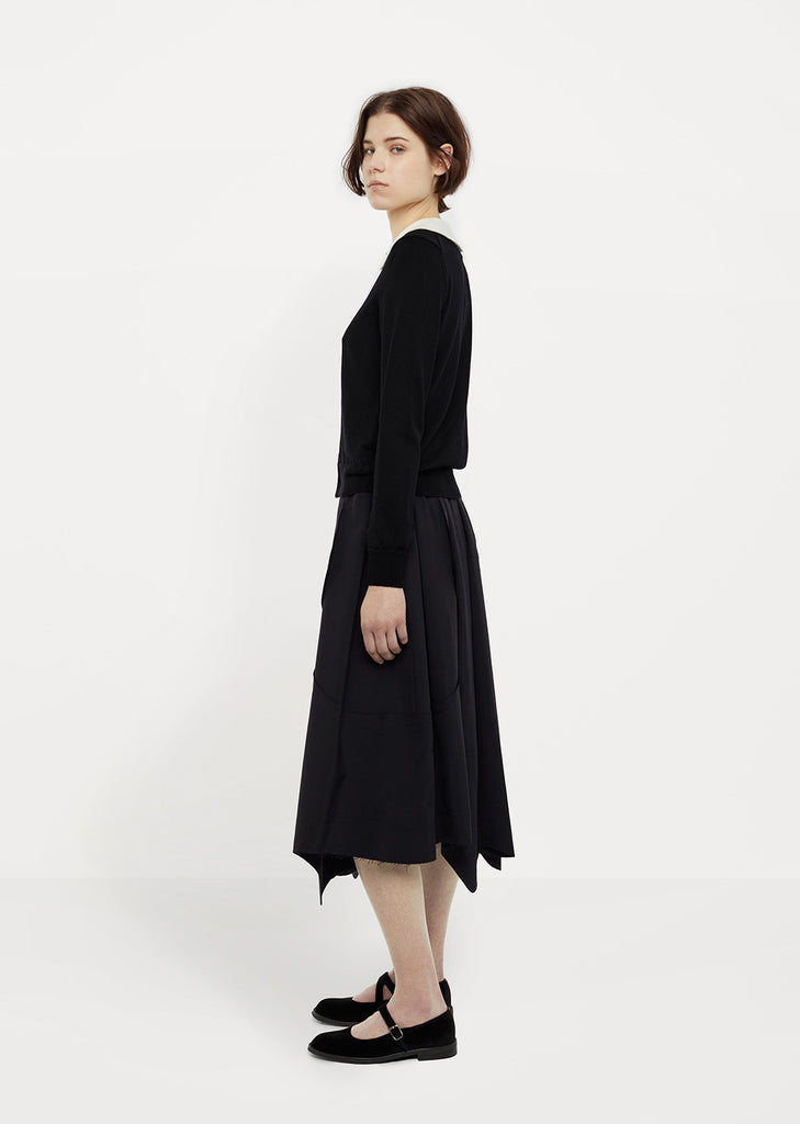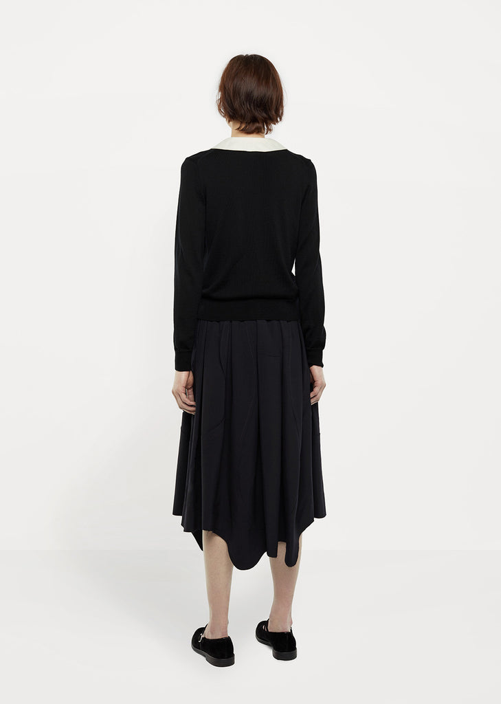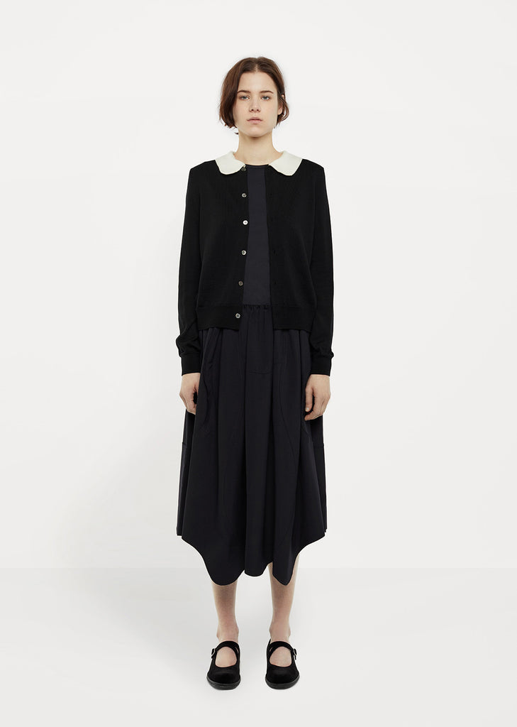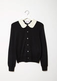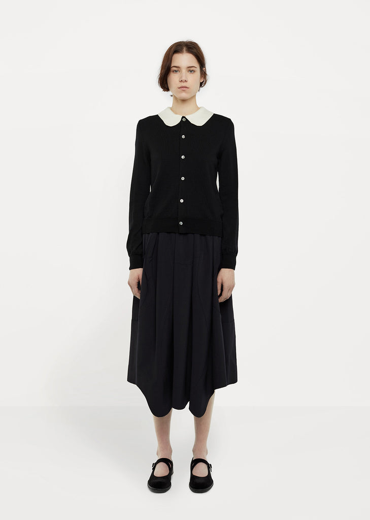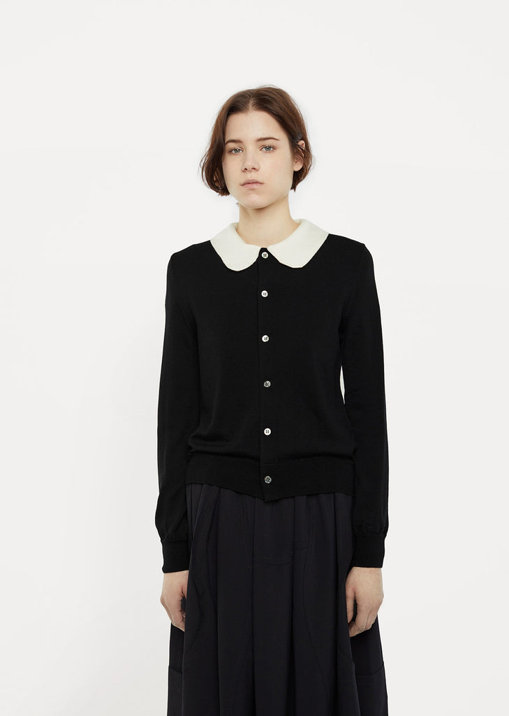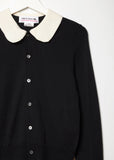 Black wool button-down cardigan with contrast white peter pan collar. Relaxed fit. Shell button-down. Ribbed trim at cuffs and hem. Color: Black. 100% Wool. Made in Japan.