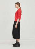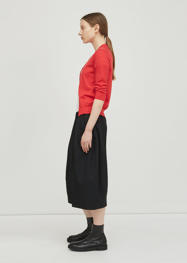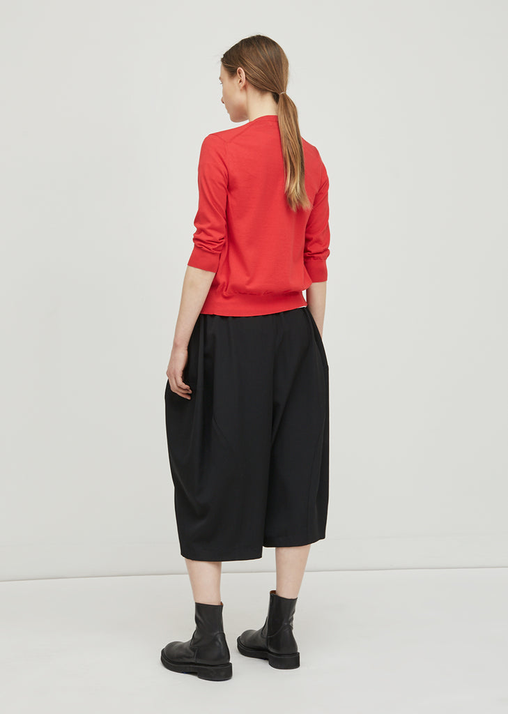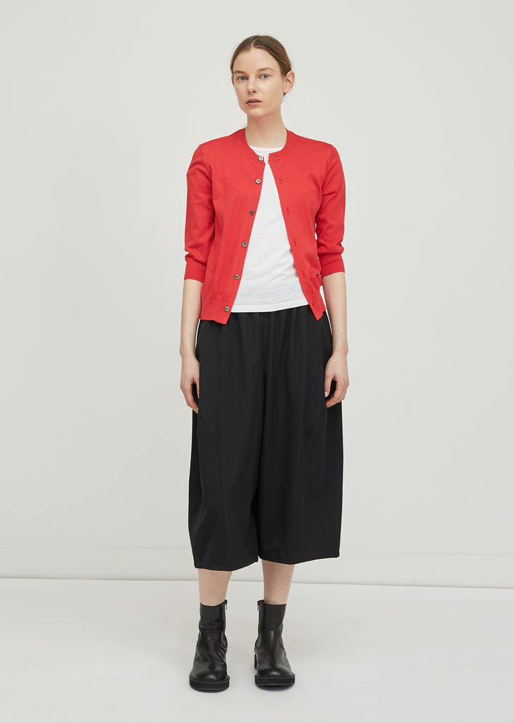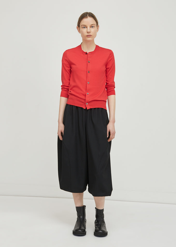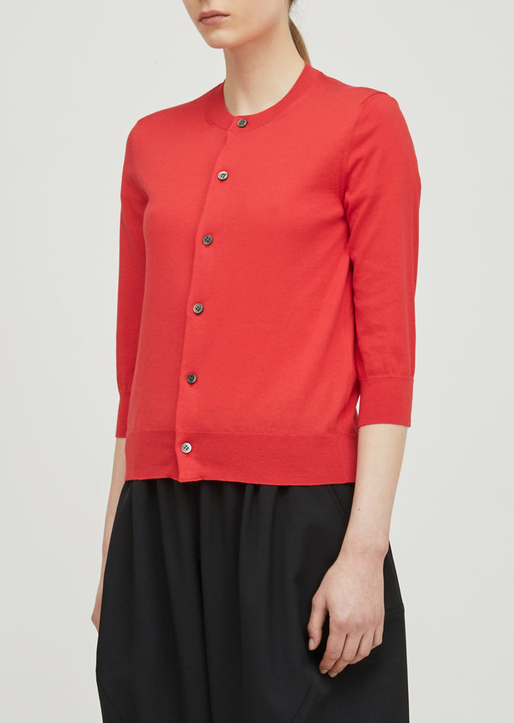 Red cropped fine knit cardigan with button down front closure. Ribbed at neckline, hem and cuffs. Slim, slightly cropped fit. Stitch detailing at shoulders. Color: Red. 100% Cotton. Made in Japan.