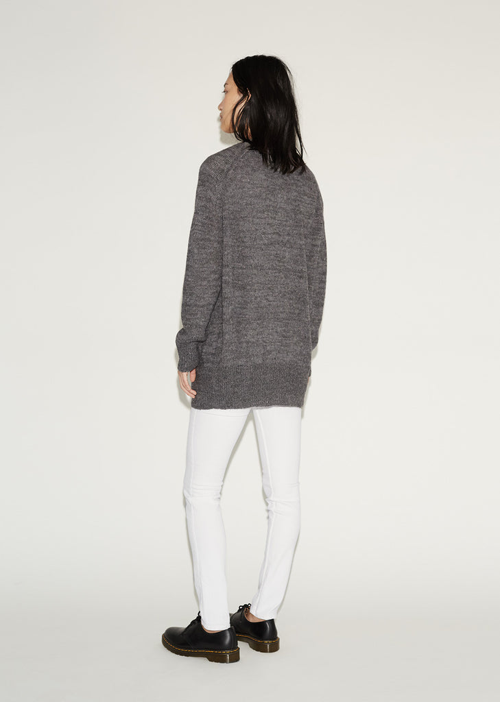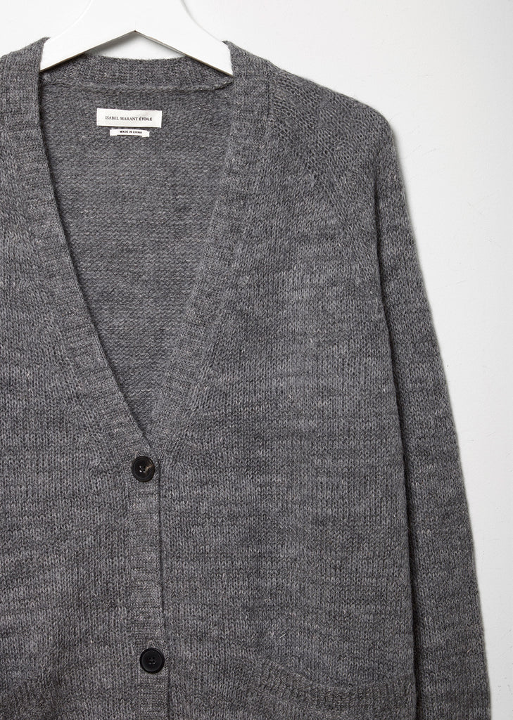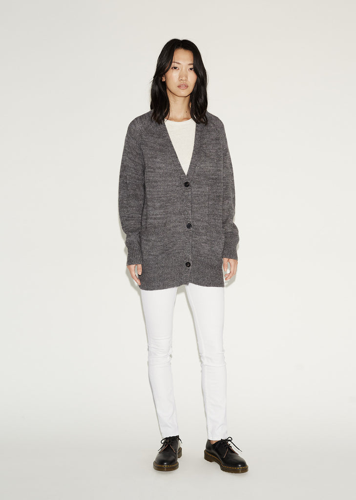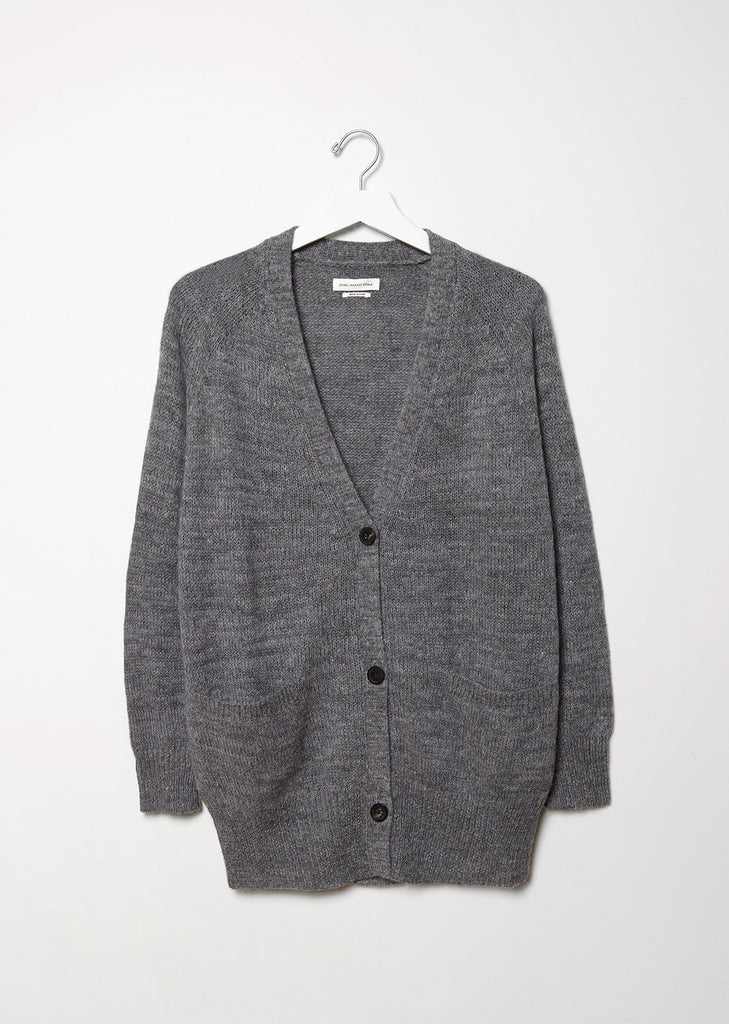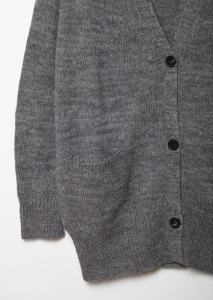 Oversized raglan cardigan with an oversized relaxed fit in grey alpaca knit. Ribbed cuffs and hem. Front patch pockets with rib trim. Fully fashioned details. Horn buttons. Color: Grey. 52% Alpaca, 29% Wool, 10% Linen, 9% Polyester. Imported.