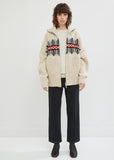 From the runway collection: Ecru zip-up sweater in a substantial wool and mohair chunky knit, featuring a multicolor motif in front. Crafted in Italy with a varied gauge knit, this oversized sweater features rib knit stand collar, along with dropped shoulder seams for a relaxed silhouette. Finished with rib trim at the cuffs and hem. Color: Ecru. 97% Wool, 2% Mohair, 1% Polyamide. Made in Italy.