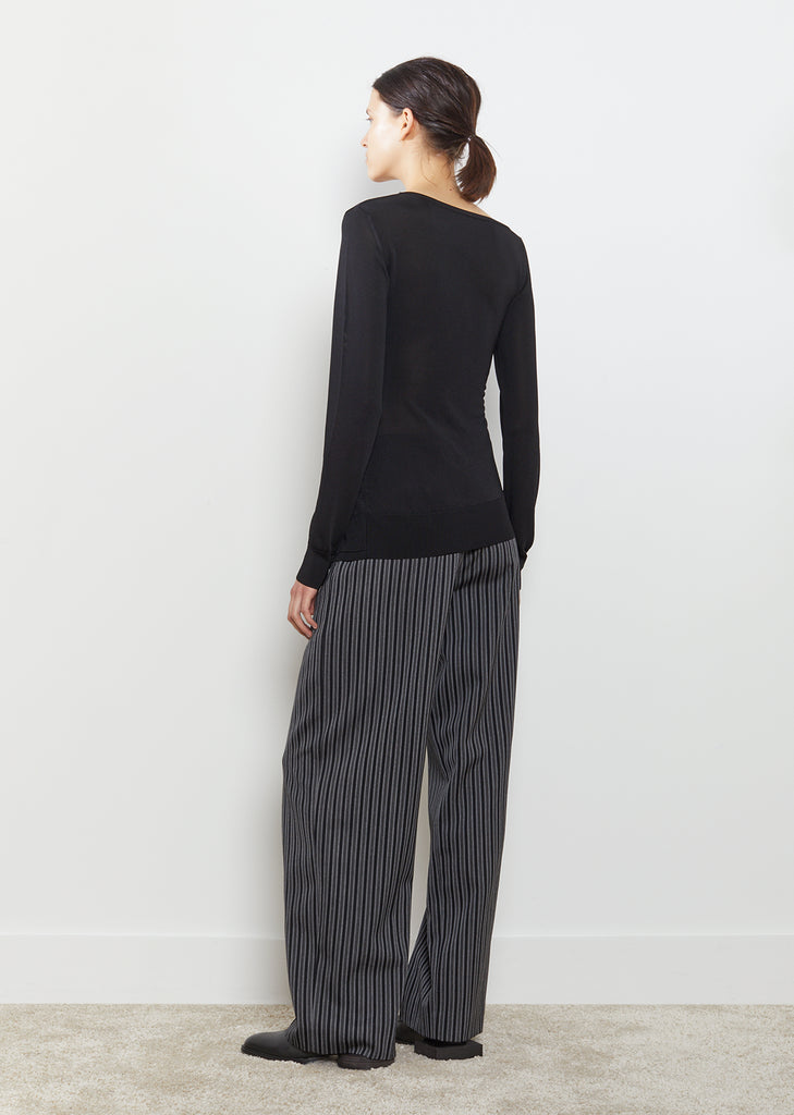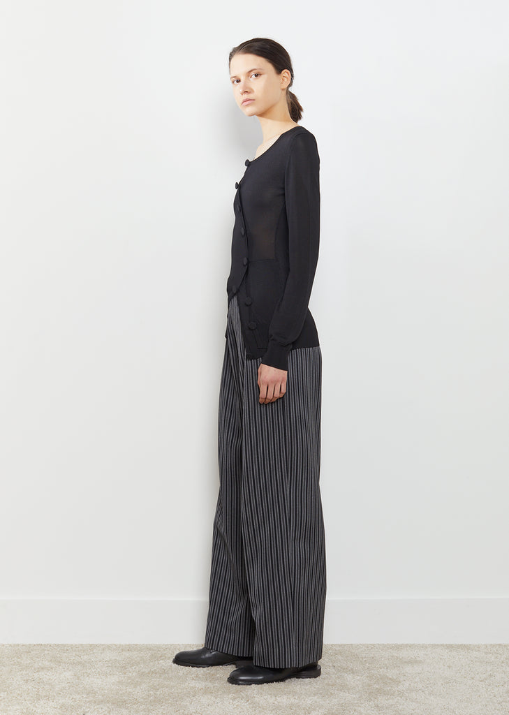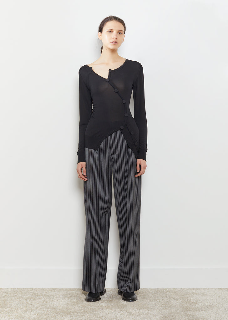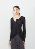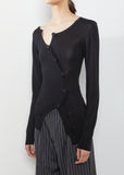 Black knit asymmetrical pullover "cardigan" sweater with nonfunctional fabric-covered buttons. Slim fit. Ribbed trim at the neck, cuffs, and hem. Ruching at the right side. Slightly longer tail hem. Color: Black. 100% Viscose.
