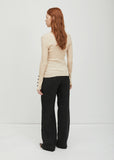 Beige ribbed cotton V-neck sweater with a faux center placket and oversized decorative buttons. Slim fit. Non-functioning buttons along neck and sleeves. Pullover style. Color: Beige. 100% Cotton Giza.