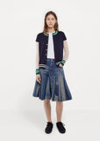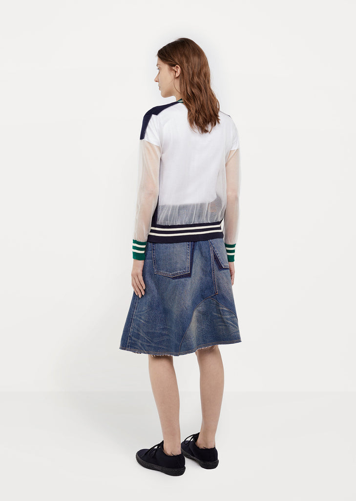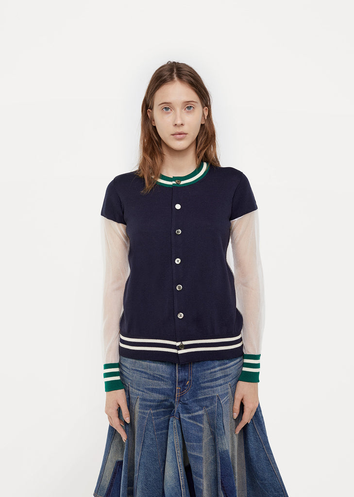 Navy wool cardigan with white mesh paneling at the back and sleeves. Classic fit. Shell button closure. Green and white elasticized rib trim at collar and cuffs. Navy and white ribbed trim at bottom hem. Color: Navy Green. 69% Wool, 17% Nylon, 14% Polyester. Made in Japan.