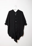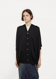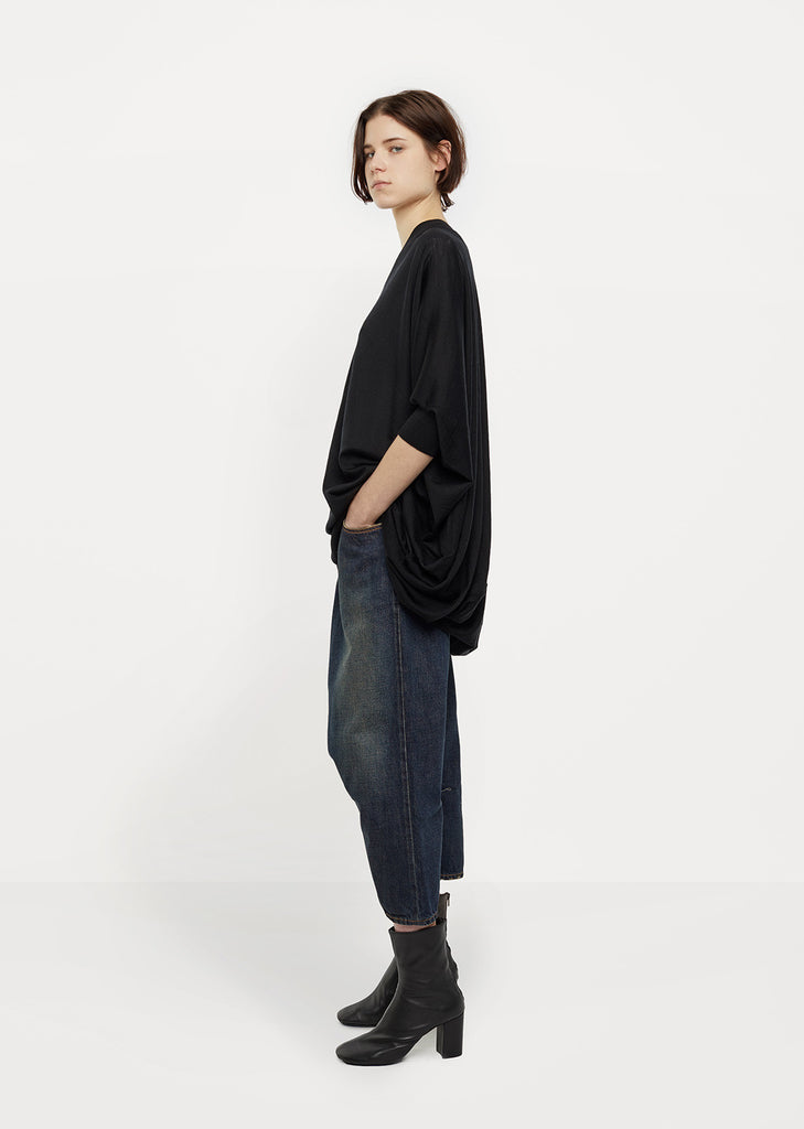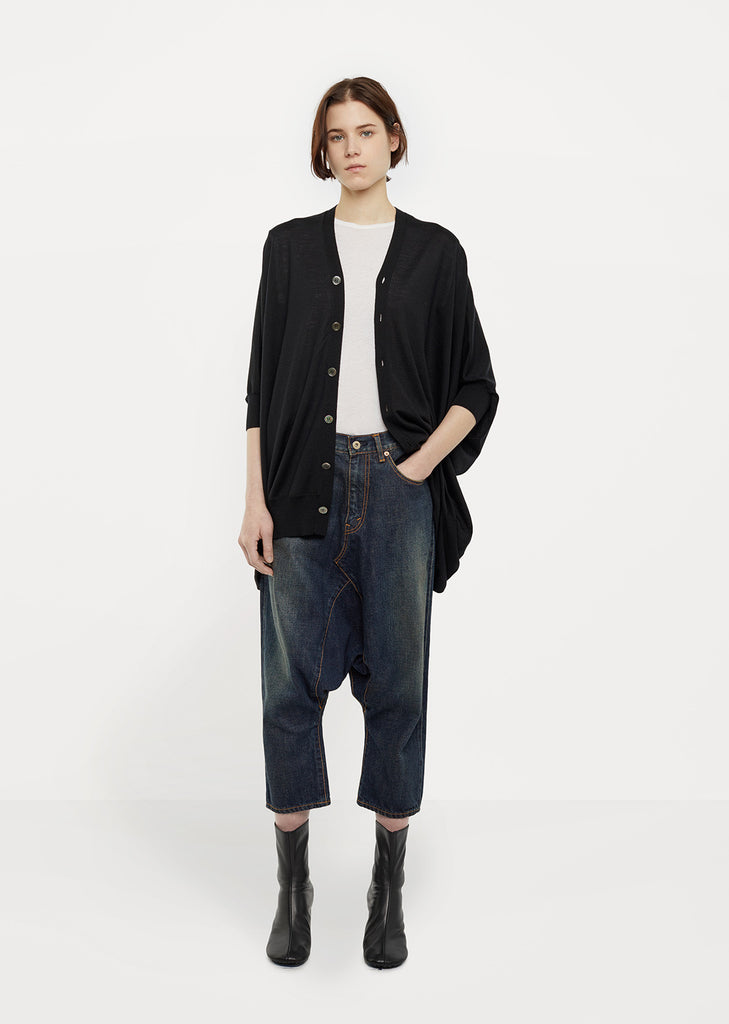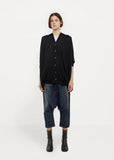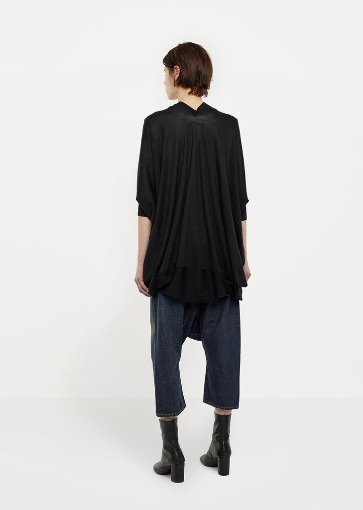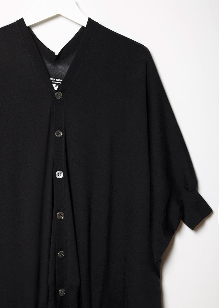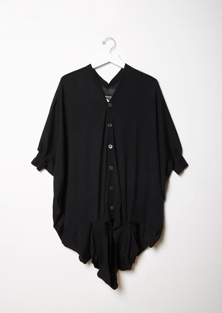 Black wool batwing cardigan, with gathered hem at sides for a swingy fit. Loose fit. V-neck. Ribbed trim at neck. Shell button-down. Color: Black. 100% Wool. Made in Japan.