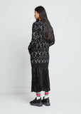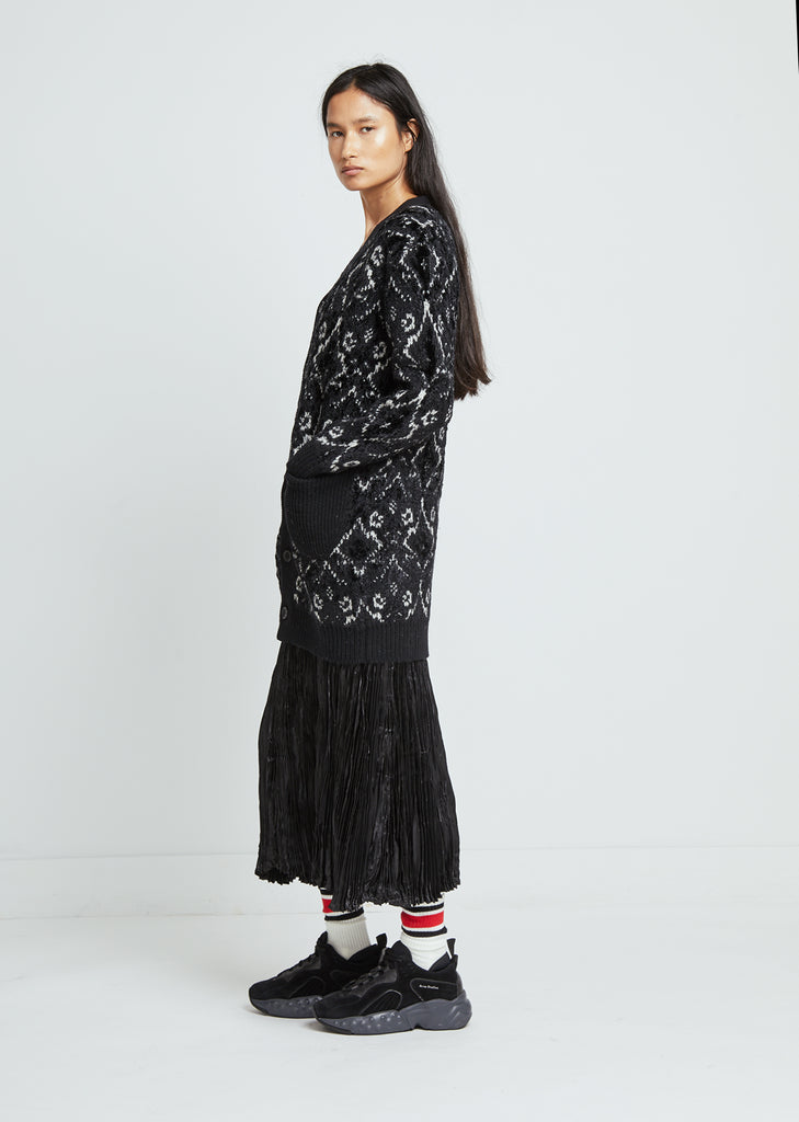 From the runway collection: a roomy wool-blend argyle cardigan woven with a black and white fuzzy jacquard. This textural oversized button front classic is crafted with black fine rib knit trim at the neck, cuffs and hem. Complete with rib knit oversized front pockets. Color: Black. 55% Wool, 45% Rayon, 5% Nylon. Made in Japan.