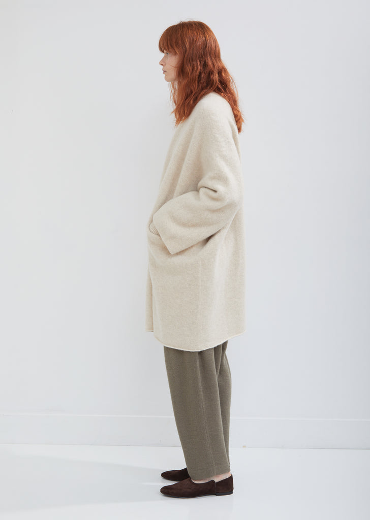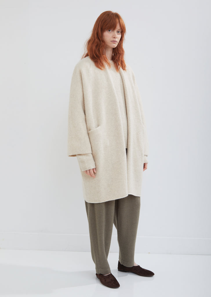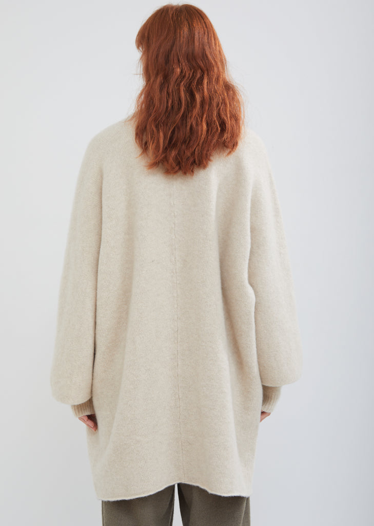 Cream dolman cardigan hand knit from a plush cashmere blend. This relaxed piece is features a relaxed, open construction with front pocketing. Finished with a subtle seam detail at the back. Color: Birch. 80% Cashmere, 18% Polyamide, 2% Elastane. Made in Peru.