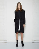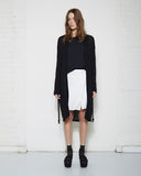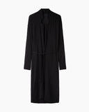 Notched lapel. Dropped shoulders. Long sleeves. Drawstring waist. Open front. Knee-length.