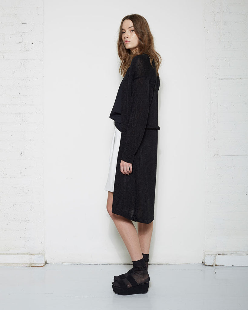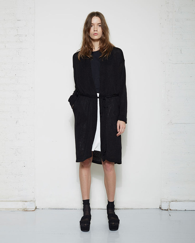 Long, robe-inspired sweater, hand-knit in a silky pima-cotton.
