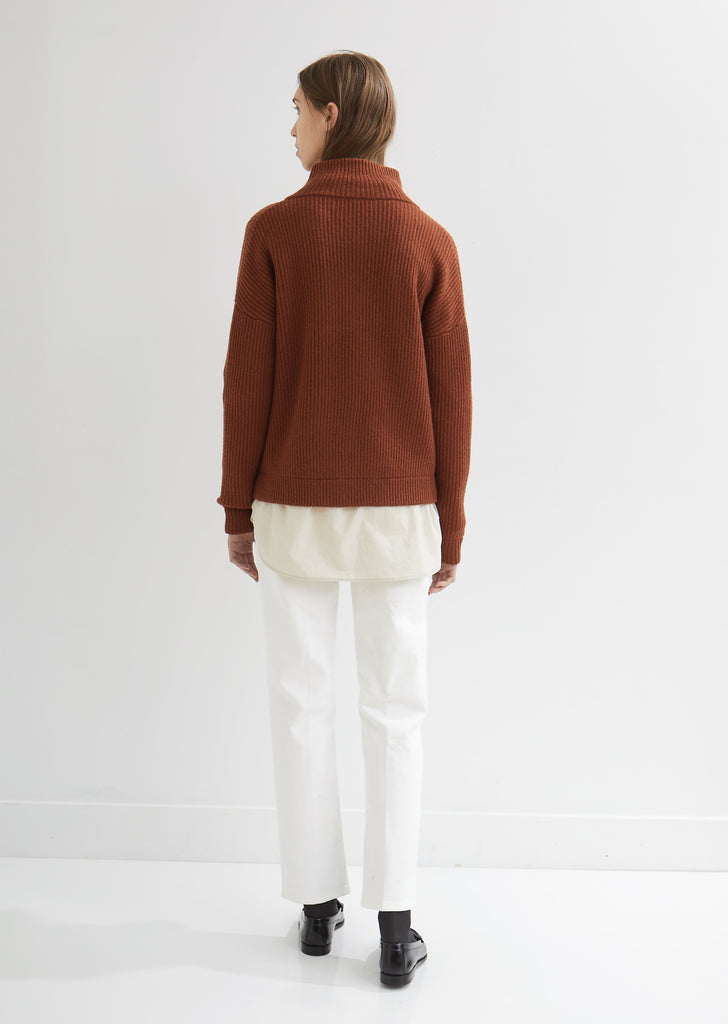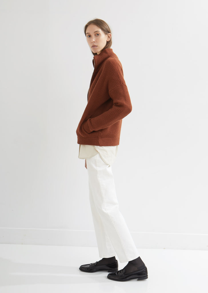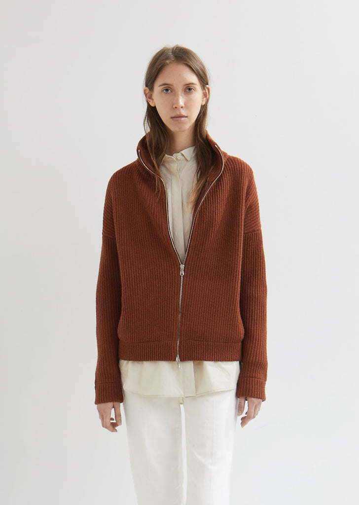 Moderne's Ae-ri cardigan in clove is crafted of a soft Italian wool and cashmere yarn, styled with a sleek silver-tone dual zipper closure in front. A new staple piece with a super soft hand-feel, with a clean rib knit composition and slip pocketing at the waist. Finished with finer rib knitting at the standing collar and cuffs. Color: Clove. 70% Wool, 30% Cashmere. Imported.