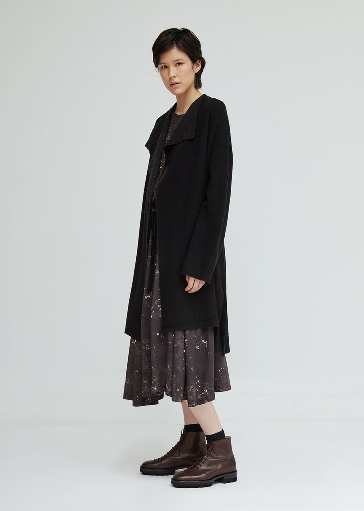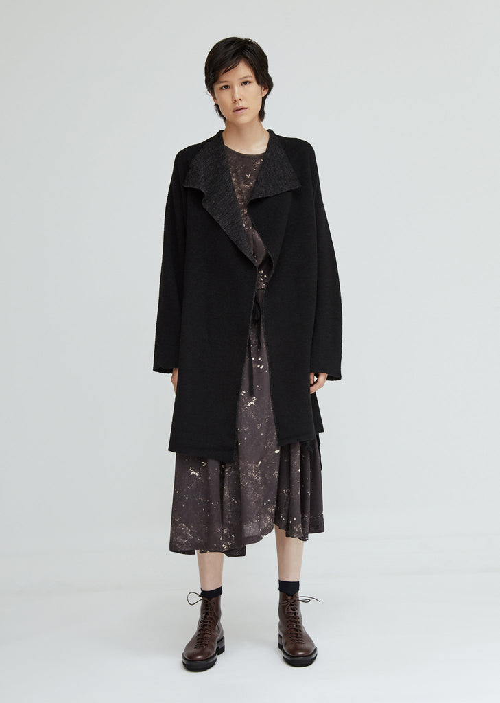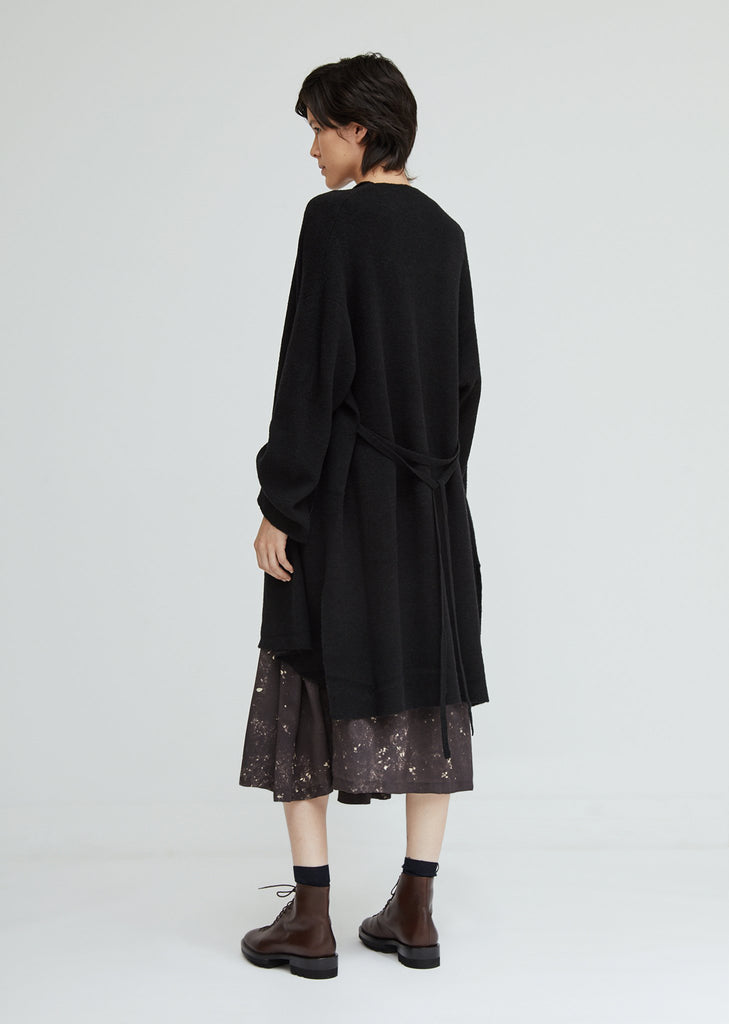 The label's wrap cardigan in a double-faced black and grey melange wool blend. A relaxed style with waterfall draped lapels and front patch pockets. Self-ties at the waist. Dropped shoulder seams. Split side seams. A seasonal repeat piece with a soft hand-feel. Color: Black. 42% Wool, 35% Acrylic, 22% Nylon, 1% Polyurethane. Made in Japan.