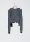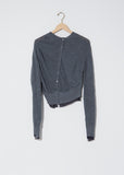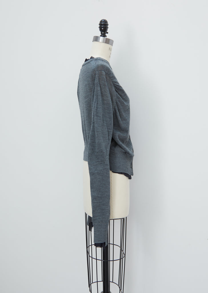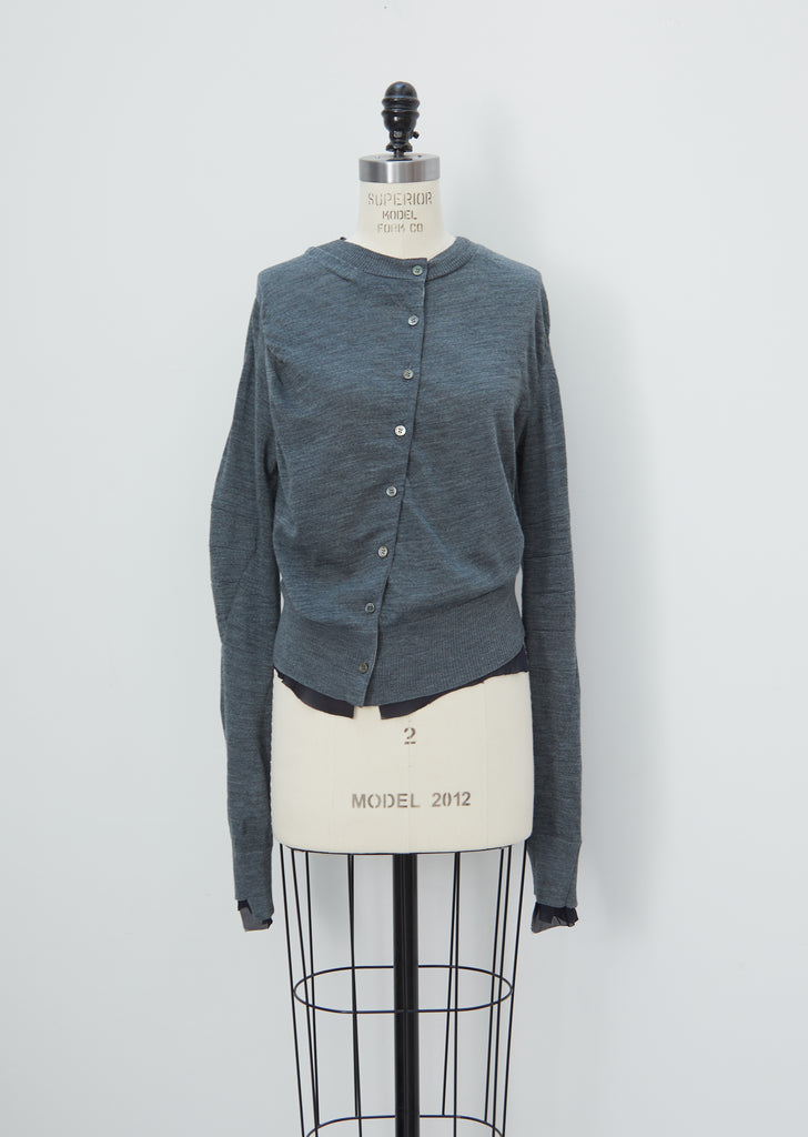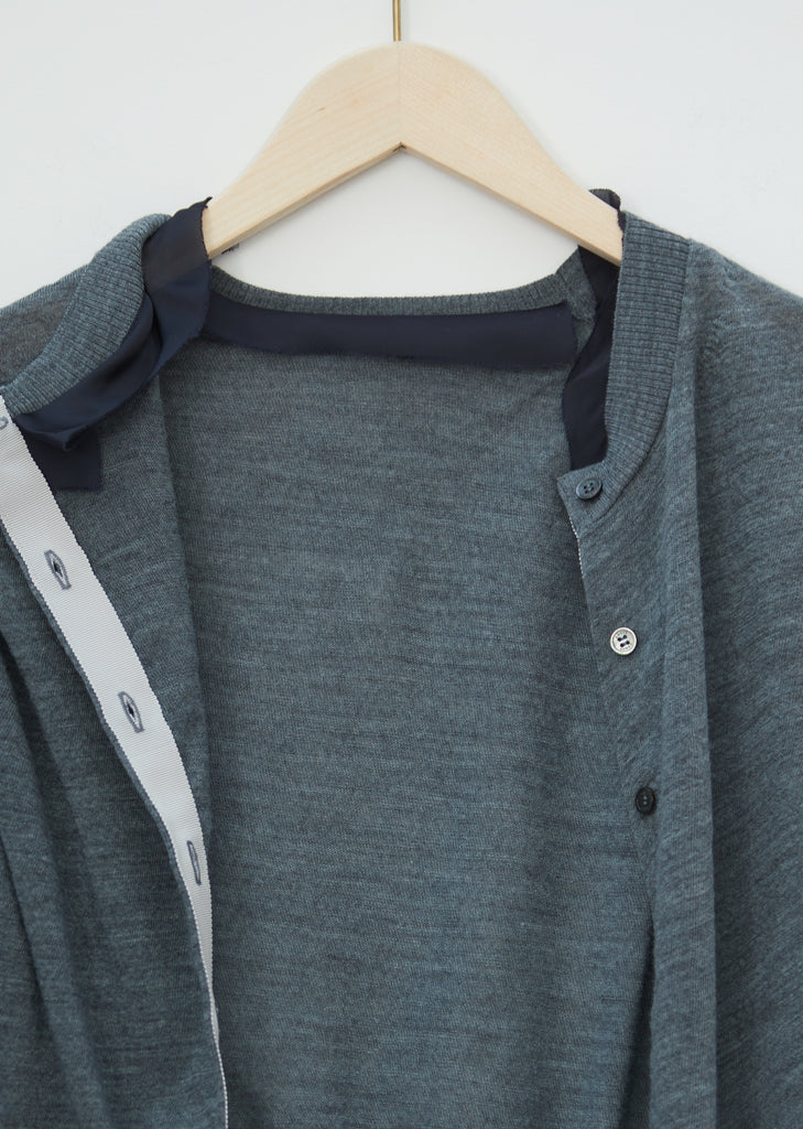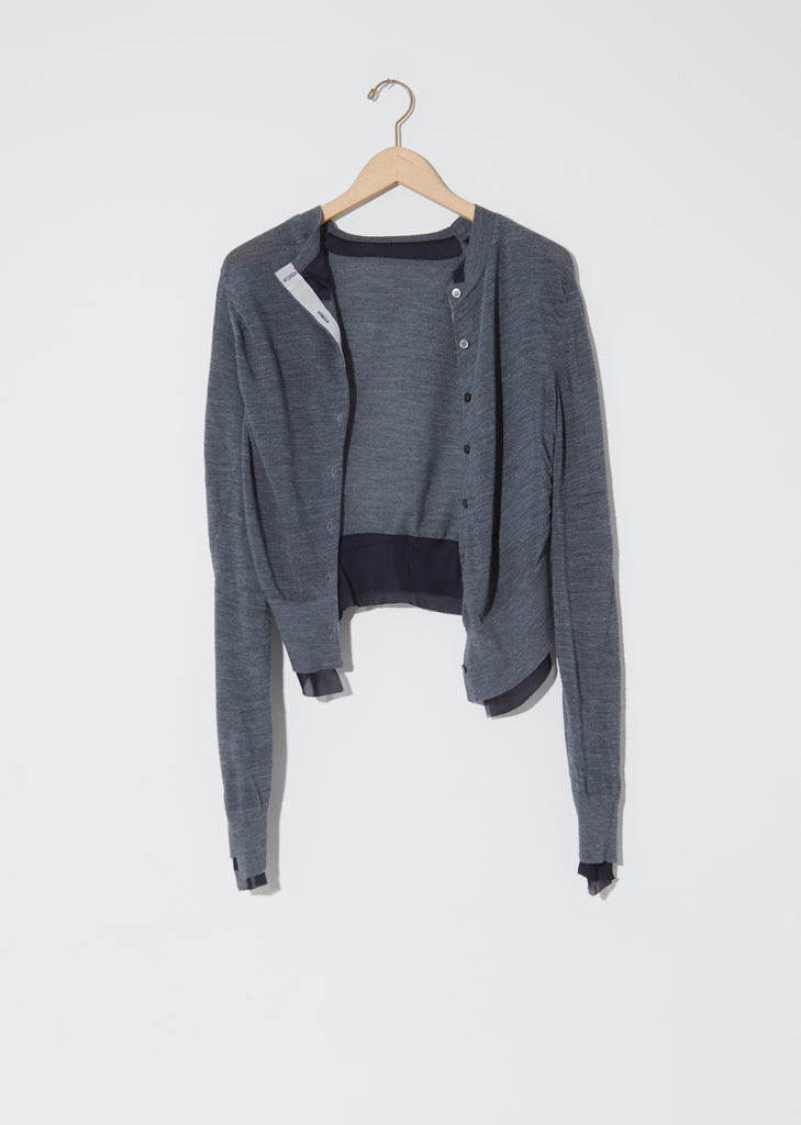 Sacai Asymmetrical Knit Cardigan in Grey. Inspired by one of Sacai's earlier seasons, this signature cardigan in wool features an asymmetrical button placket with elongated slim sleeves and navy silk chiffon insets on the neckline, hems.