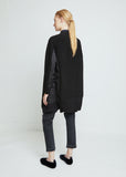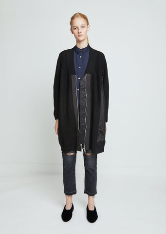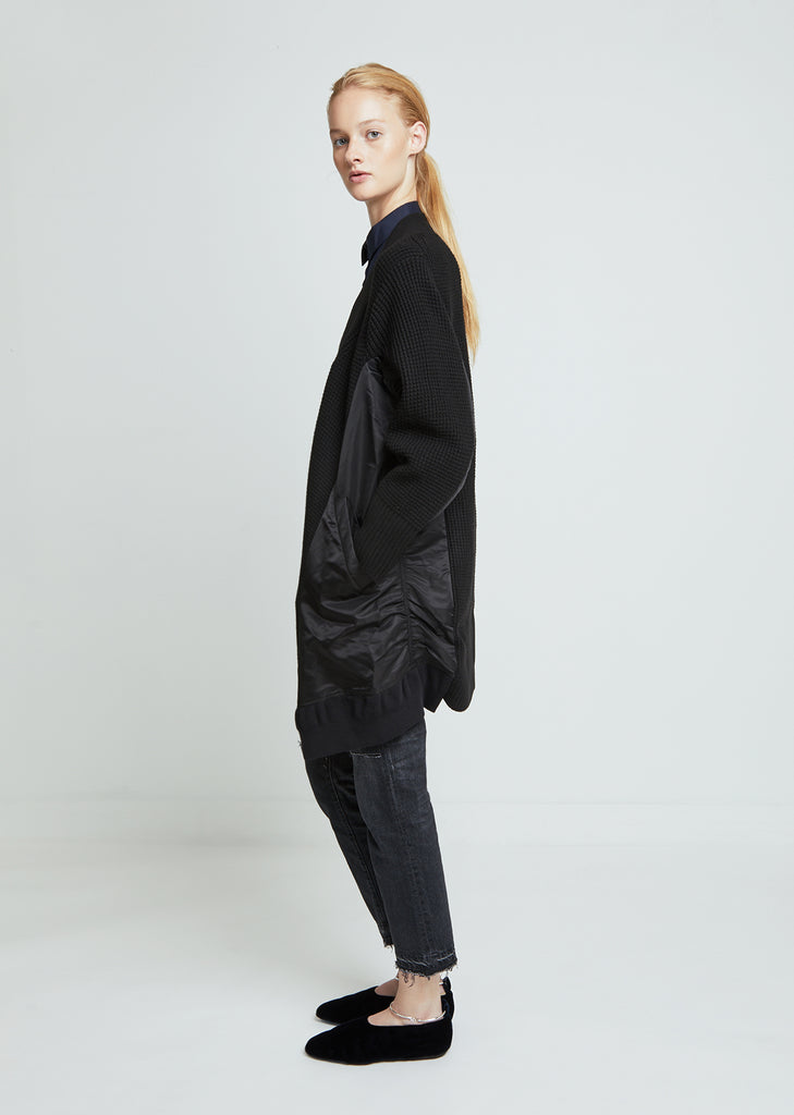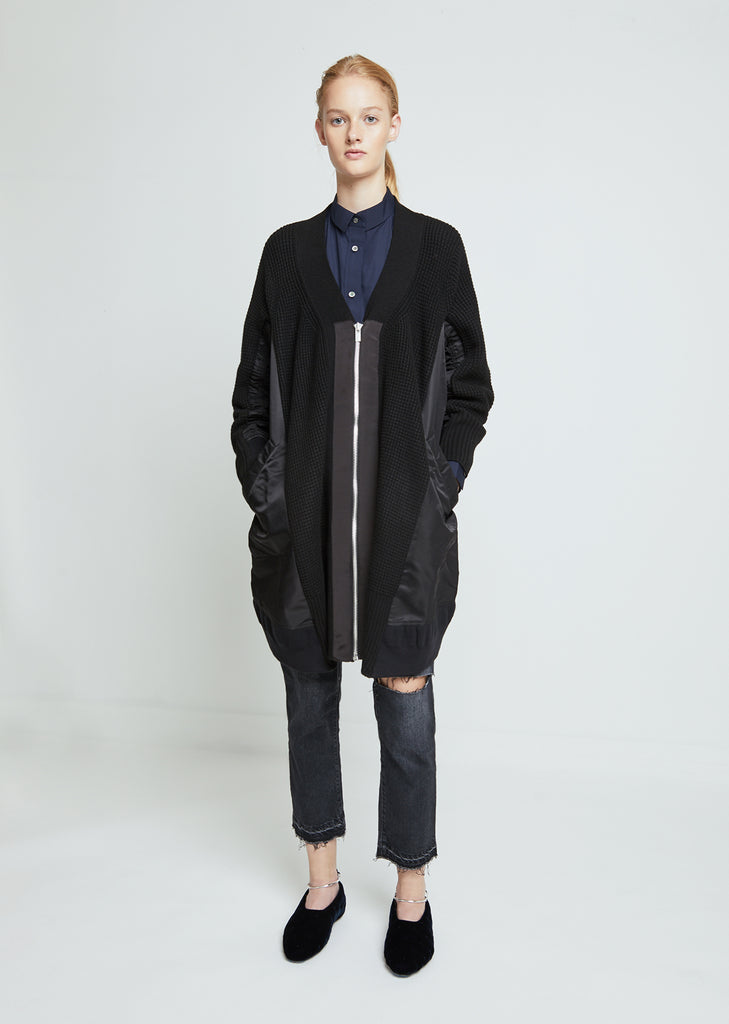 Black long waffle-knit cardigan with a contrasting white front zip and classic MA-1 bomber detailing throughout. Relaxed, slight cocoon fit. MA-1 puffer nylon detailing along the sleeves and sides. Snap-button welt pockets. Contrasting white ribbed trim at the cuffs and bottom hem. Color: Black. 100% Wool; Attached Parts: 100% Nylon; 50% Cotton, 50% Polyester; 100% Cupro; Filling: 100% Polyester. Made in Japan.