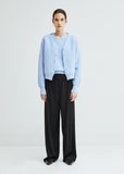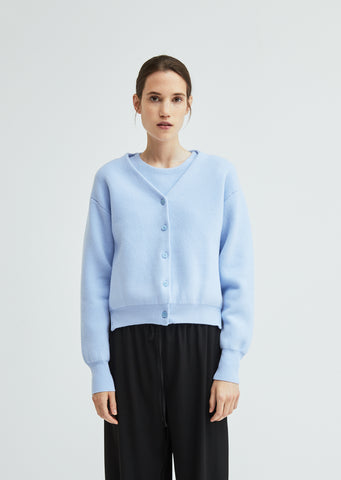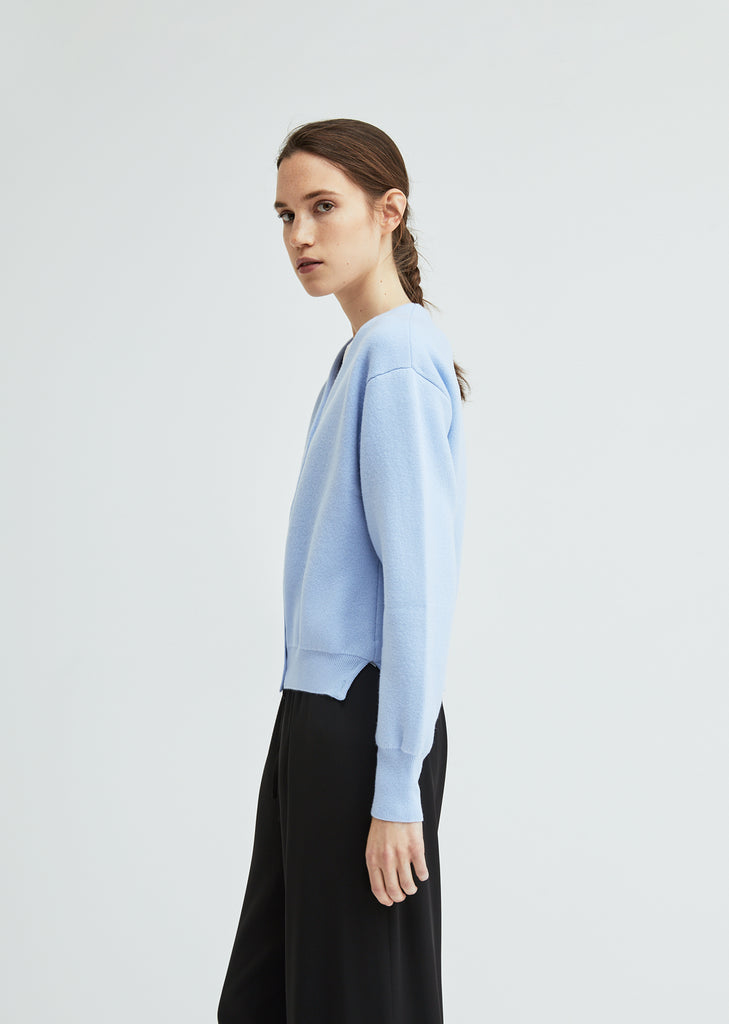 Light blue felted merino wool–cashmere cardigan. Button front closures. Side seam splits with button closures. Finely ribbed cuffs and hem. Dropped shoulder seams. Color: Blue. 80% Merino Wool, 20% Cashmere. Made in Italy.
