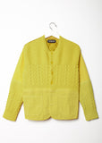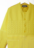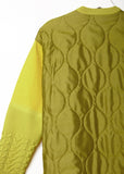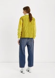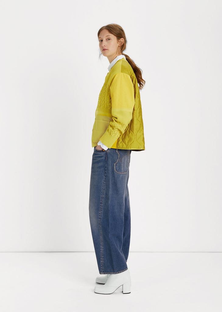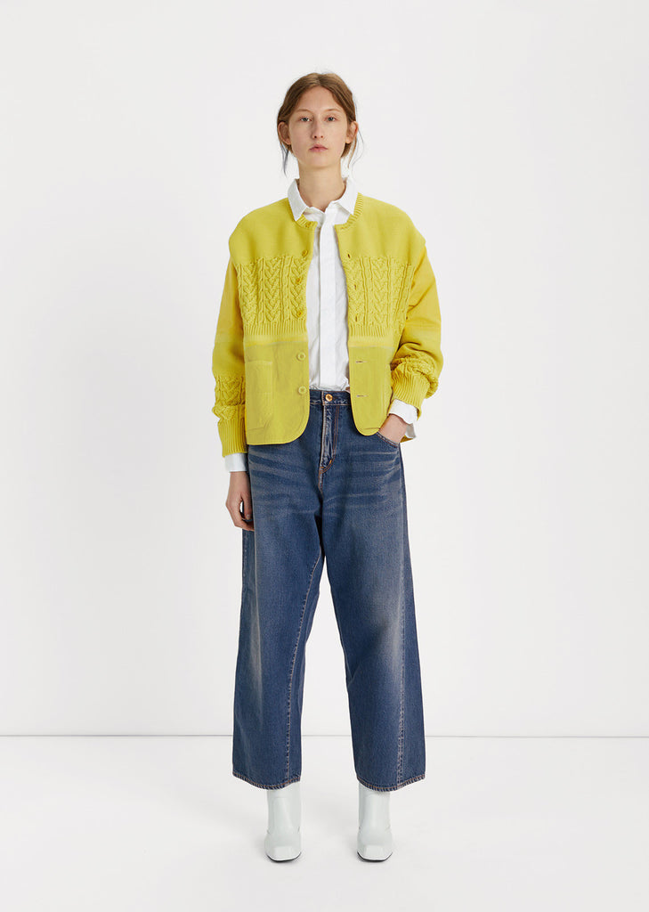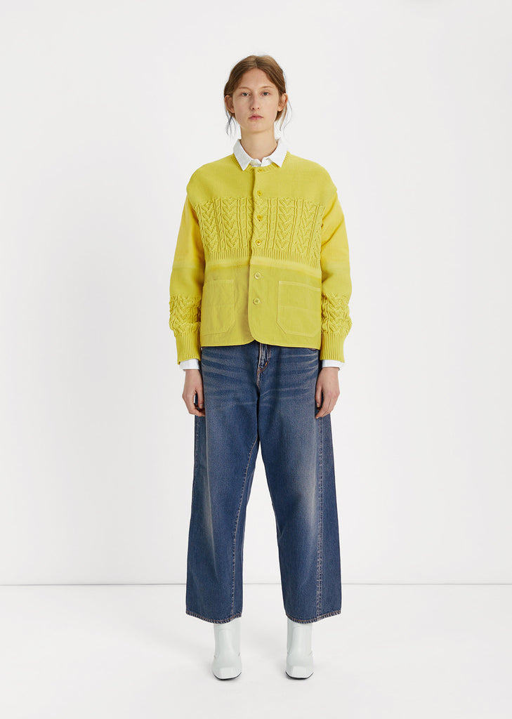 Yellow multitextured cable-knit cardigan with seamlessly pieced silk and nylon blended accents at the sleeves and pockets. Relaxed fit. Subtle drop shoulders. Tonally resonant quilted back. Ribbed trim at collar. Front patch pockets. Color: Yellow. Backing: 100% Polyester. Made in Japan.
